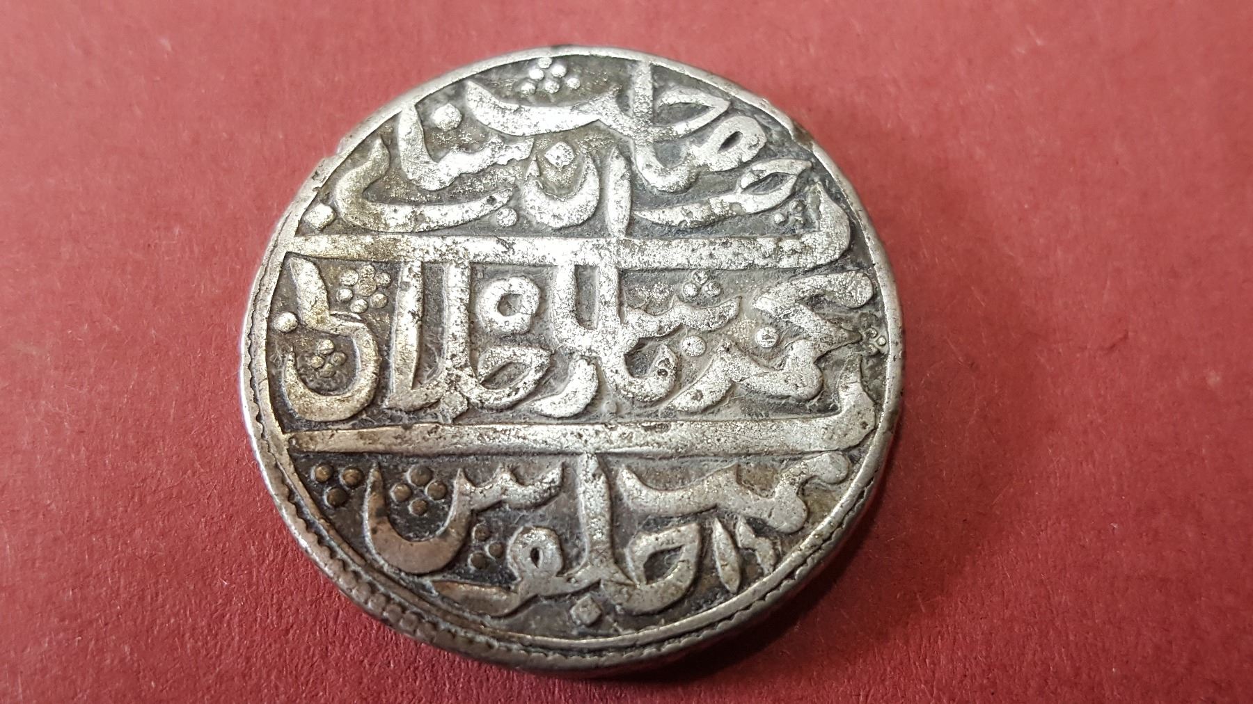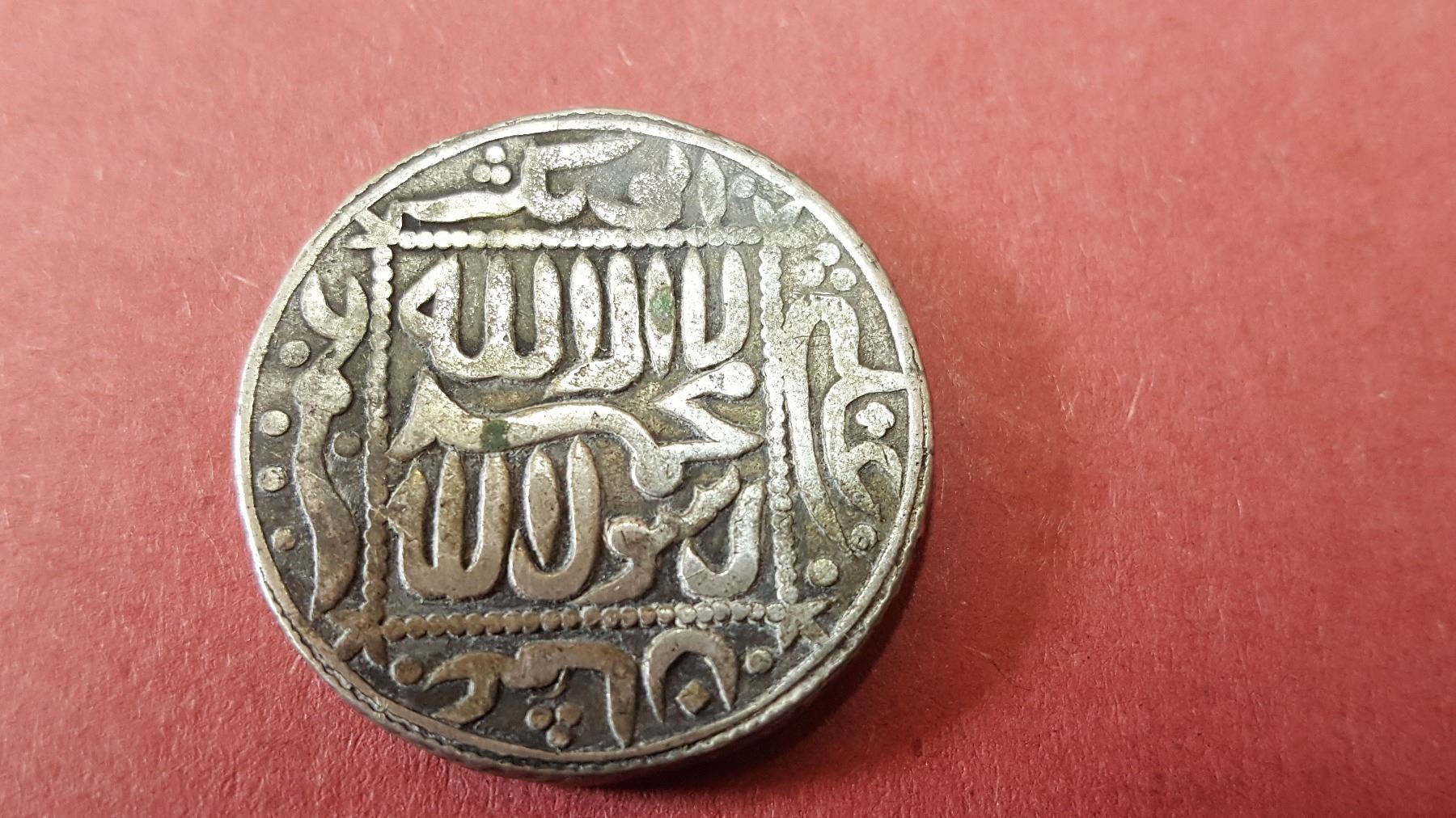 observe - Kalimah written in box in middle. names of the 4 Caliphas written ouside the box on 4 sides of the coin.