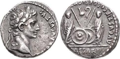 Ancient Roman Augustus. 27 BC-AD 14. Silver Denarius (16.5mm, 3.83 g, 12h). Lugdunum (Lyon) mint. Struck 2 BC-AD 12. Laureate head right / Caius and Lucius Caesars standing facing, two shields and two spears between them; above, on left, simpulum right, and on right, lituus left. RIC I 207; Lyon 82; RSC 43. Toned, Good VF. Bold portrait.
