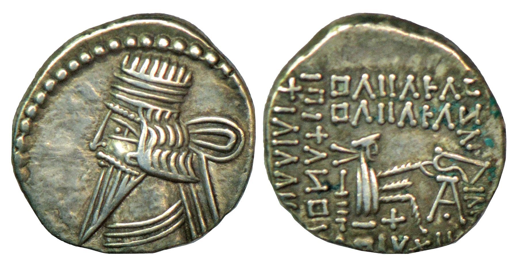 Prathian Empire, Vologases III (105-147 AD), silver drachm, 3.81g. Obv: Diademed bust of king facing left. Rev: Archer seated right on throne holding bow & kharoshti legend around, MACW 671-673.