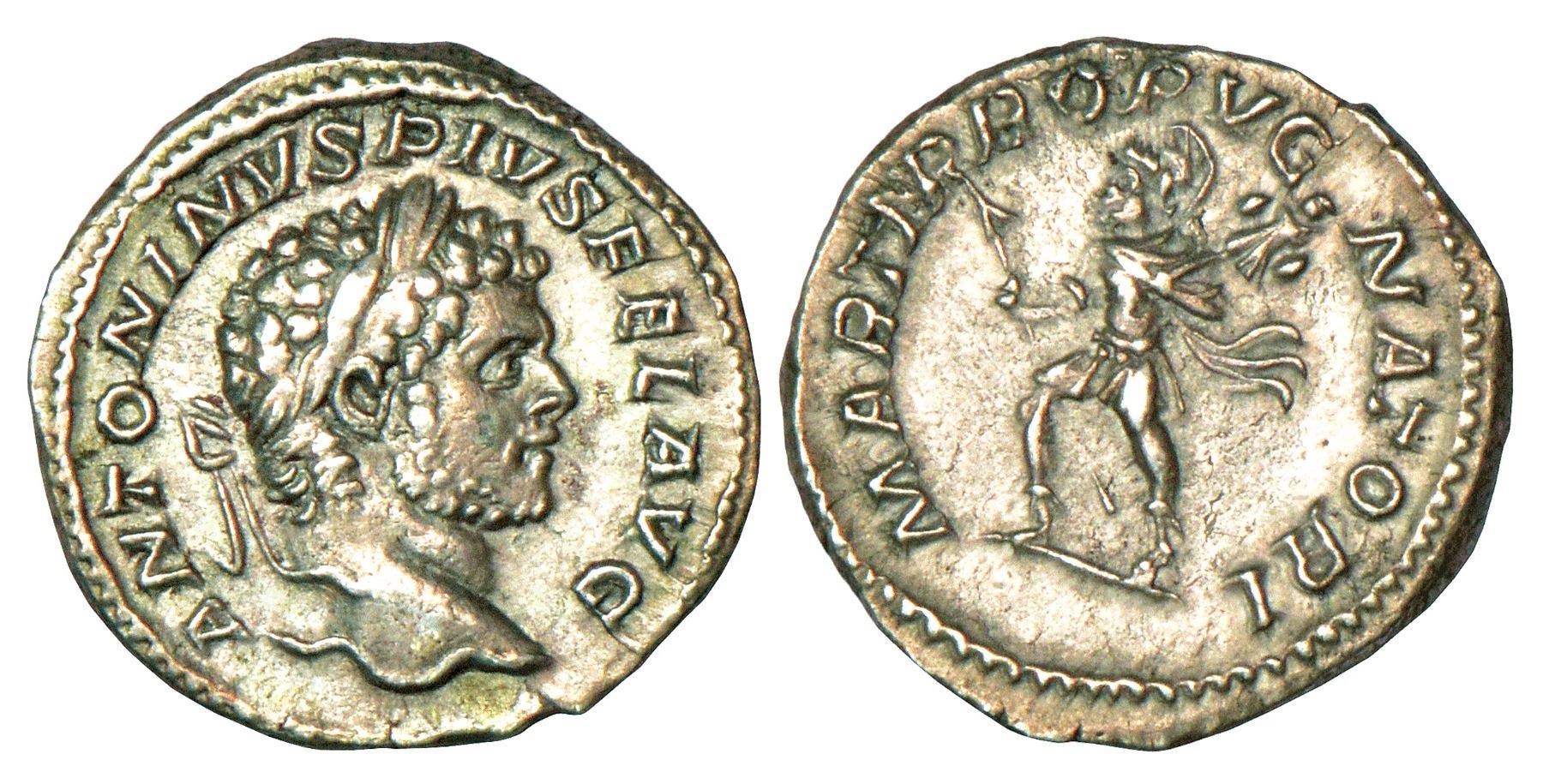 Roman Empire, Caracalla (198-217 AD), silver denarius, Rome mint, RIC 235, 3.11g. Obv: Laureate head right, legend ANTONINVS PIVS FEL AVG. Rev: Mars walking left, holding spear and trophy, legend MARTI PROPVGNATORI.