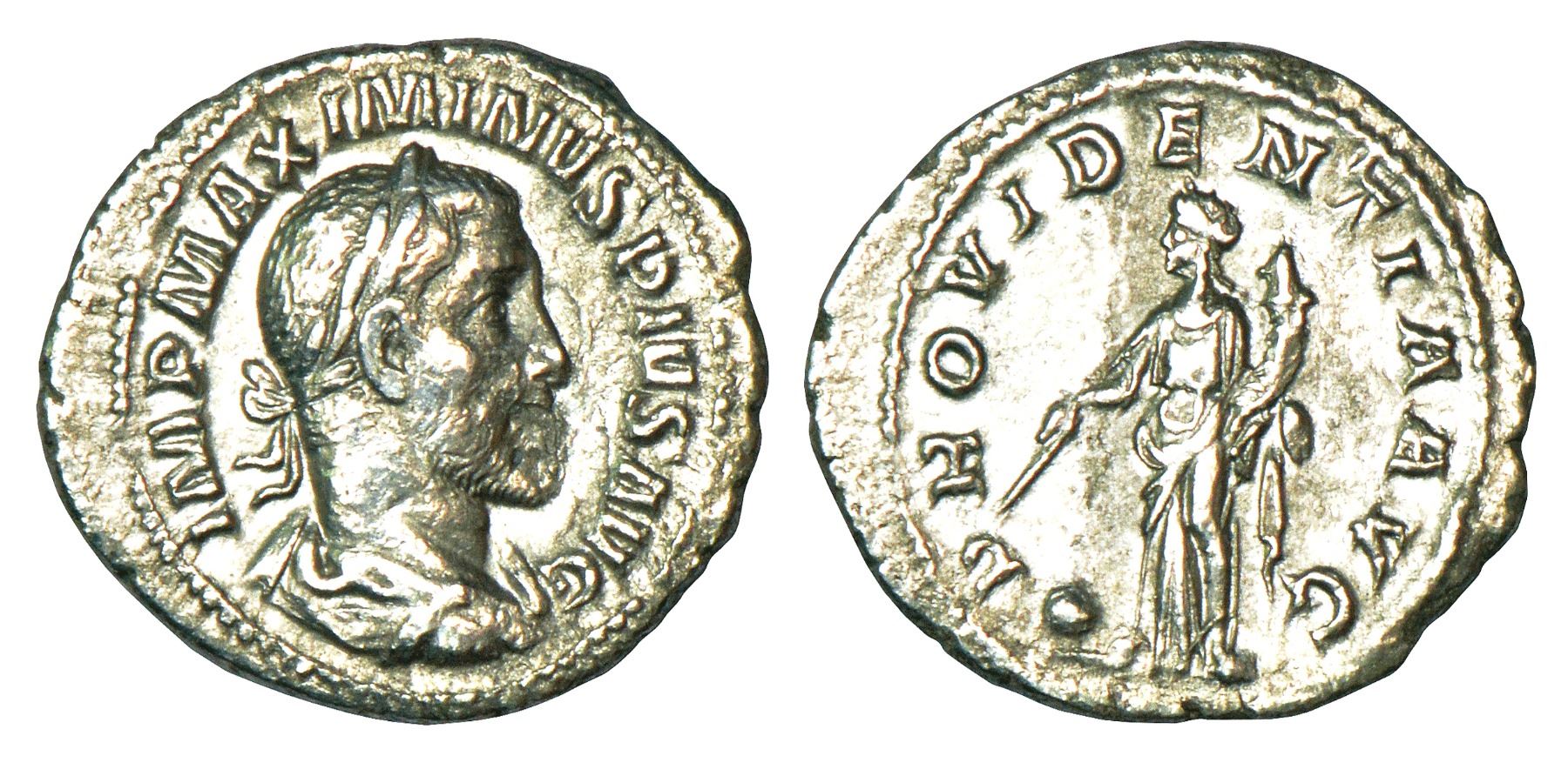 Roman Empire, Maximinus I (235-238 AD), silver denarius, Rome mint, RSC 77a, 2.68g. Obv: Laureate draped bust right, legend IMP MAXIMINVS PIVS AVG. Rev: Providence standing left holding cornucopia and wand pointed at globe at foot, legend PROVIDENTIA AVG.
