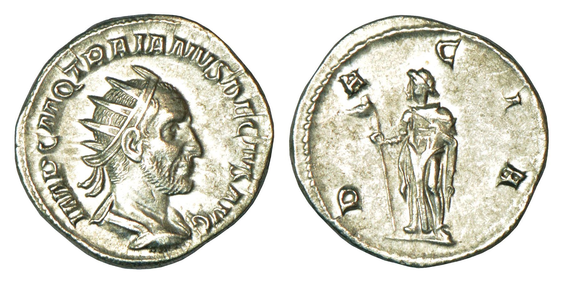 Roman Empire, Trajan Dacius (249-251AD), silver antoninianus, Rome mint, RSC 16, 3.68g. Obv: Radiate, draped, & cuirassed bust right, legend IMP C M Q TRAIANVS DECIVS AVG. Rev: Dacia standing left, holding 'draco standard' or vertical staff surmounted by donkey's head, legend DACIA.
