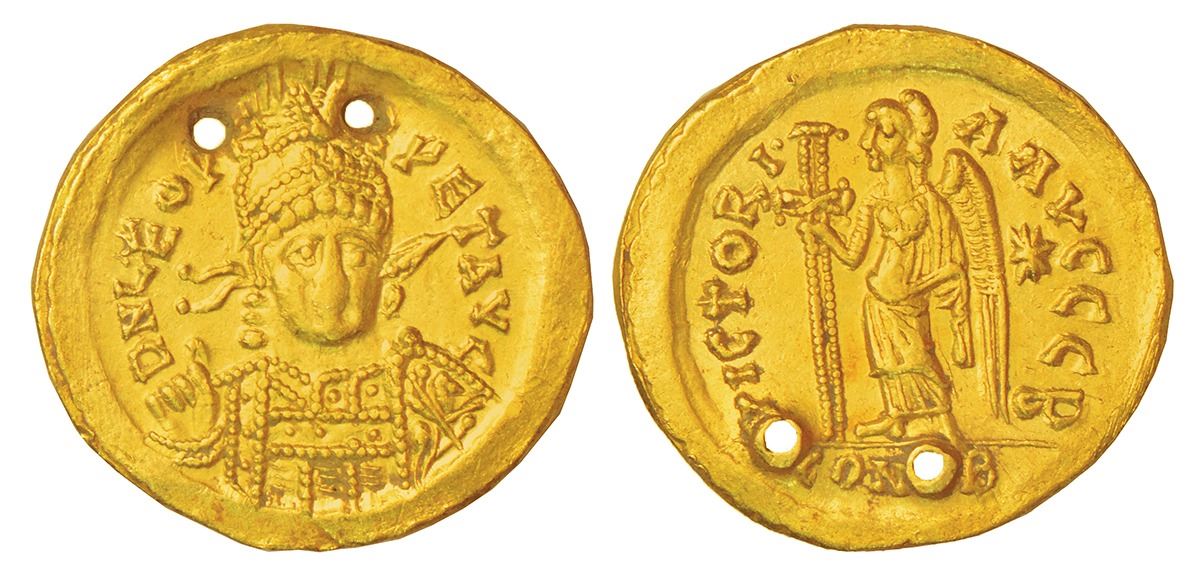 Ancient World: Roman Empire, gold solidus of Leo I (457-474 AD), Constantinople mint, struck during 462-466 AD, with two piercings, 4.42g. Obv: Front-facing bust of the emperor with helmet and pearl diadem, holding a spear and shield; legend DN LEO PERPET AVG around. Rev: Victoria standing left with a large decorated cross behind, a star in the field behind, in exergue CONOB; legend VICTORIA AVG GGΓ around.