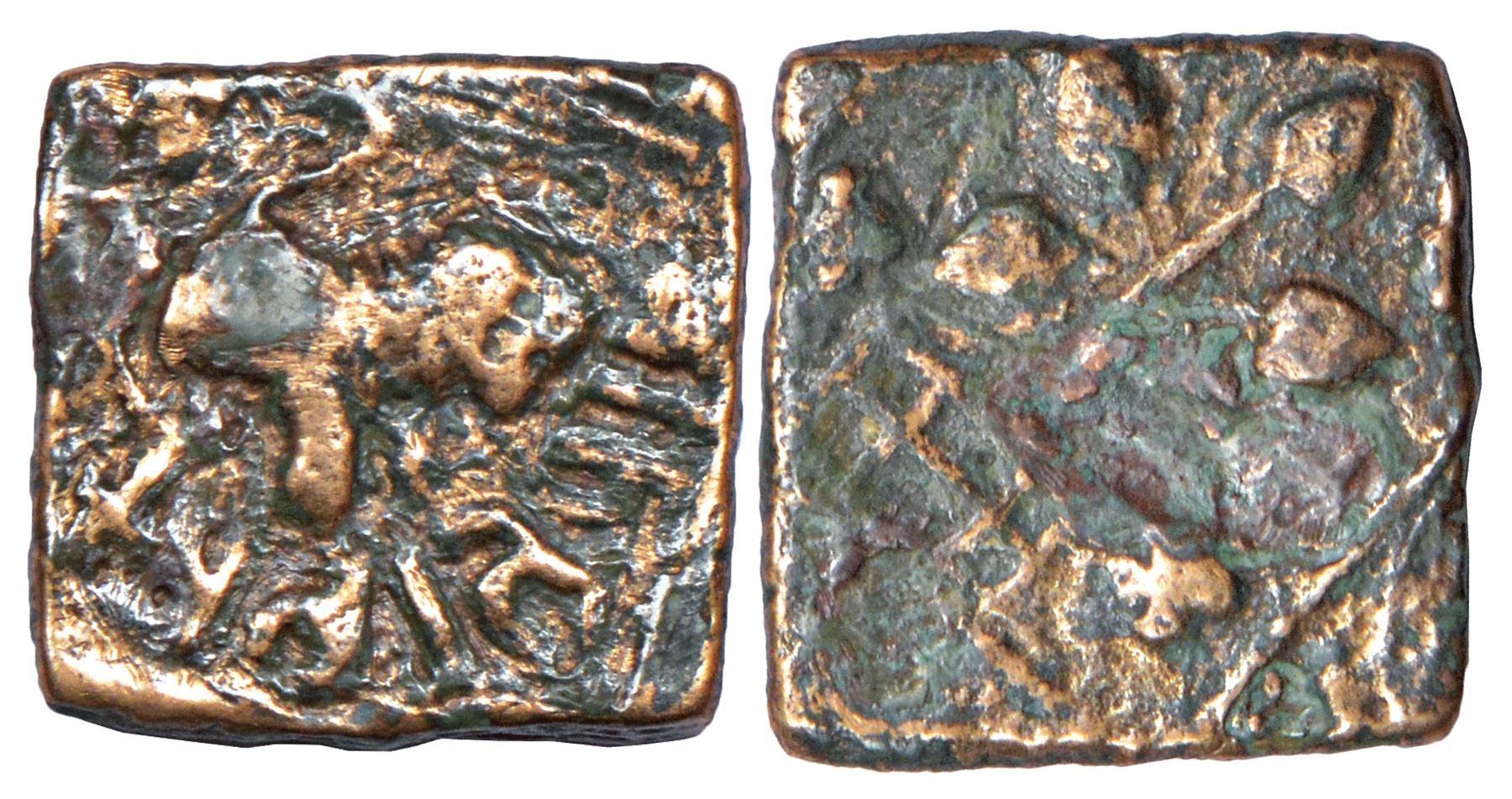 Satavahanas, 'seated Lion' type alloyed copper coin of Siri Satakani (100-50 BC), Newase-Paithan region, 3.50g. Obv: Lion seated on its haunches in profile, facing right; Brahmi legend Raño Siri Satakani… to its right. Rev: Tree with five leaves in a railing, flanked by Swastikas in a rectangular border.