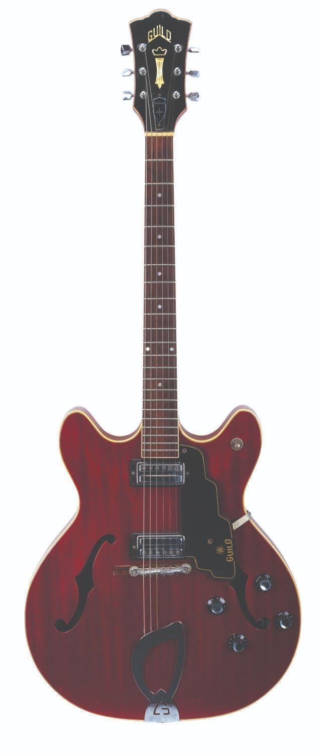 (Guild, 1964) Andy Gibb’s personal 1964 Guild Starfire IV six-string electric guitar and its black leather case. Unlike his older brothers who formed the Bee Gees, Gibb pursued a solo career, scoring three number-one hits before his untimely death at age 30. His gorgeous red guitar bears the serial number EL 1500. Measuring 42” x 3.5” x 17”, the guitar displays in very good condition with scratches, wear from use, and scuffs including a 2.5” scuff on the reverse. The 45” x 5” x 18.5” case is in fair condition with heavy wear throughout from use.