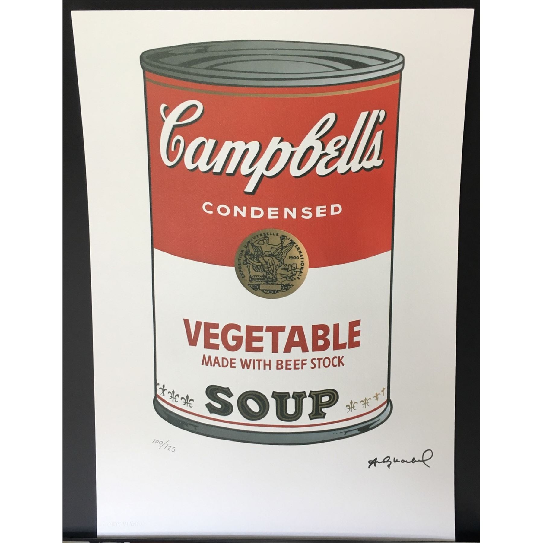 Limited edition 100 of 125 Campbell's Vegetable soup Lithograph with Andy Warhol dry stamped (embossed) in the left corner of the paper with a black stamped signature in the right. Also, including a blue stamped signature on the verso.