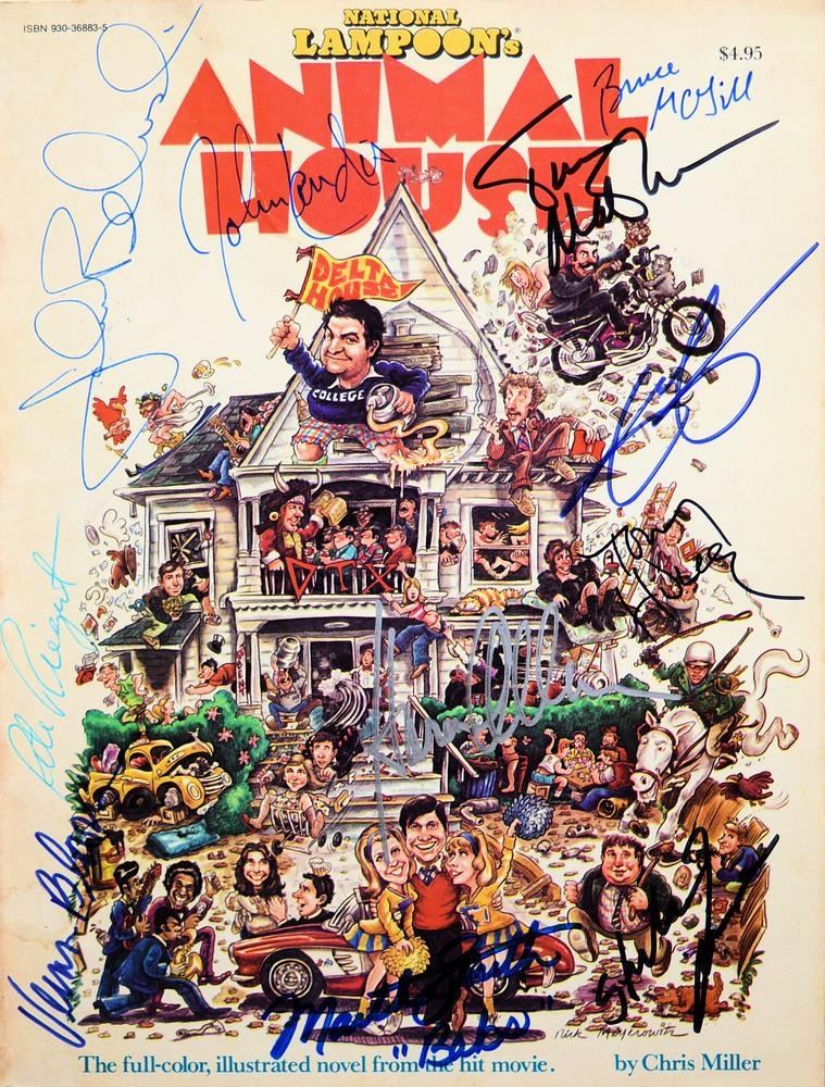 Animal House 1978 cast signed book autographed by John Belush, Pete Riegert, Verna Bloom, John Landis, Karen Allen, Marth Smith, Bruce McGill, Tim Matheson, Tom Hulce, Mark Metcalf and Stephen Furst
