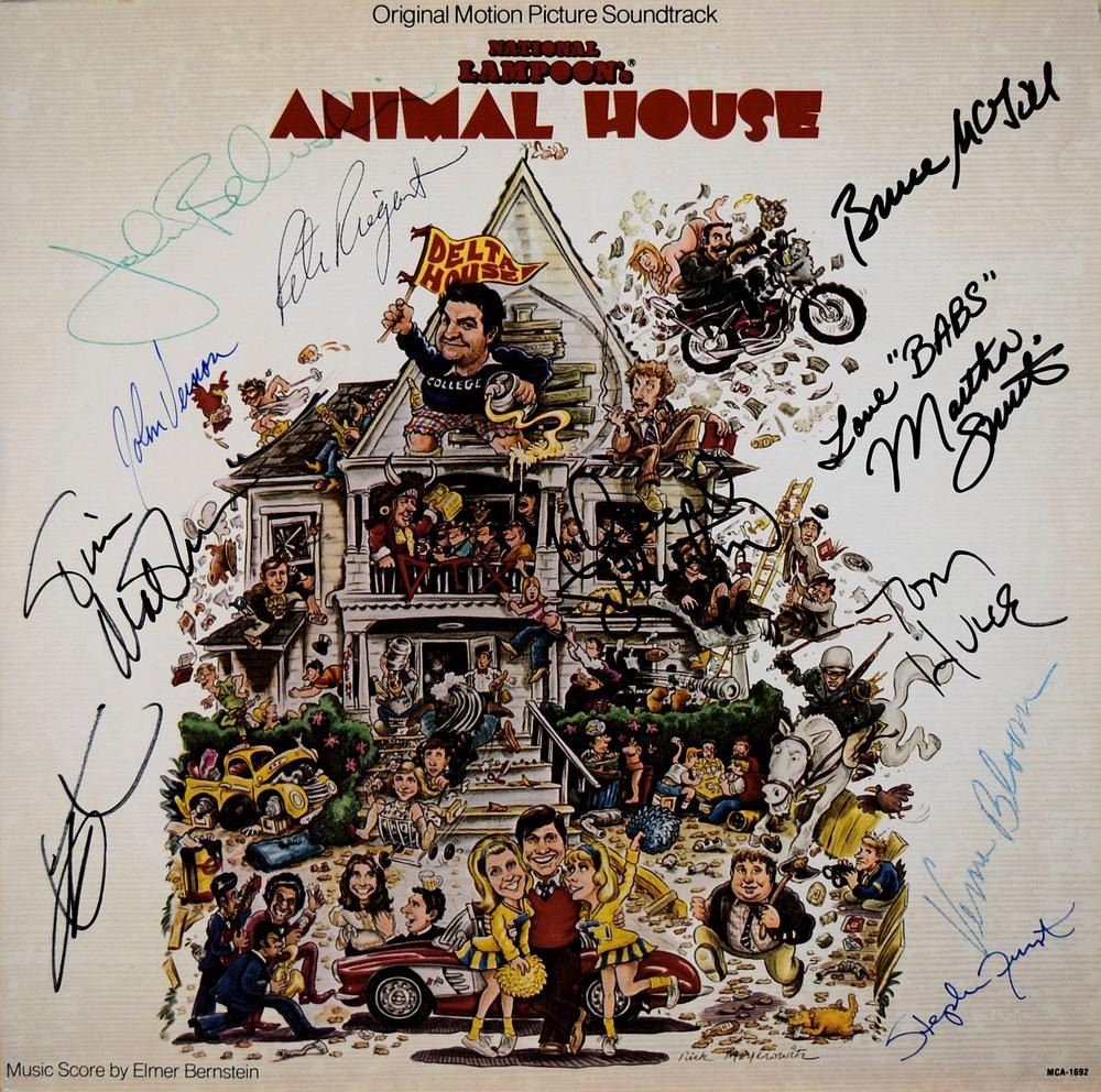 National Lampoon's 1978 Animal House soundtrack album. Signed: John Belushi, John Vernon, Tom Hulce, Mark Metcalf, Tim Matheson, Donald Sutherland, Bruce McGill, Verna Bloom, Stephan Furst, Pete Riegert & Love BABS Martha Smith.