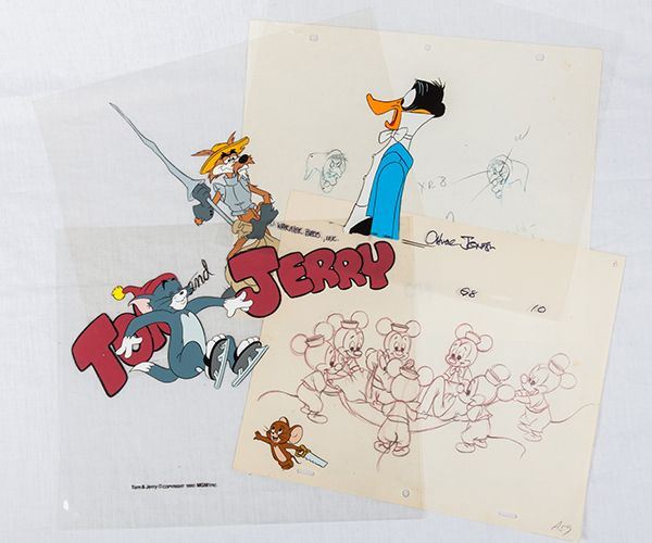 Animation Group - Tom & Jerry, Daffy Duck, Pluto's Party, Etc (1) Tom and Jerry - two hand-painted animation cels, with 1980, MGM copyright, and one page with original art of two witch faces (2) hand-painted cel of Daffy Duck signed by Chuck Jones, with Warner Bros., Inc. copyright (3) original drawing, number "A59" from the 1952 cartoon, "Pluto's Party," showing Pluto being tossed in a blanket by seven of Mickey's nephews; and (4) a hand-painted cell of Don Coyote, number "C24."