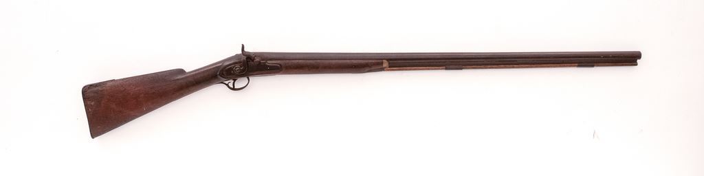 Antique American Percussion Fowler, NVSN, 14 bore, unmarked 34" tapered round barrel made without sights; beveled lockplate with stepped rear has illegible markings under nipple bolster, is likely an English import; brass furniture includes trigger guard with finial front, long rear tang, shotgun-style buttplate with long top tang, nosecap, rear ramrod thimble; two iron thimbles retain the plain hardwood ramrod within the walnut halfstock. Mfg'd middle 1800s. Condition is good, the iron surfaces being deep brown with scattered erosion (heavy at nipple area), brass with dark age-toning. Stock is sound with occasional nicks and dings, battering and erosion at upper buttplate. Action works, smoothbore shows moderate black-powder erosion. Est.: $300-$500. (Antique)