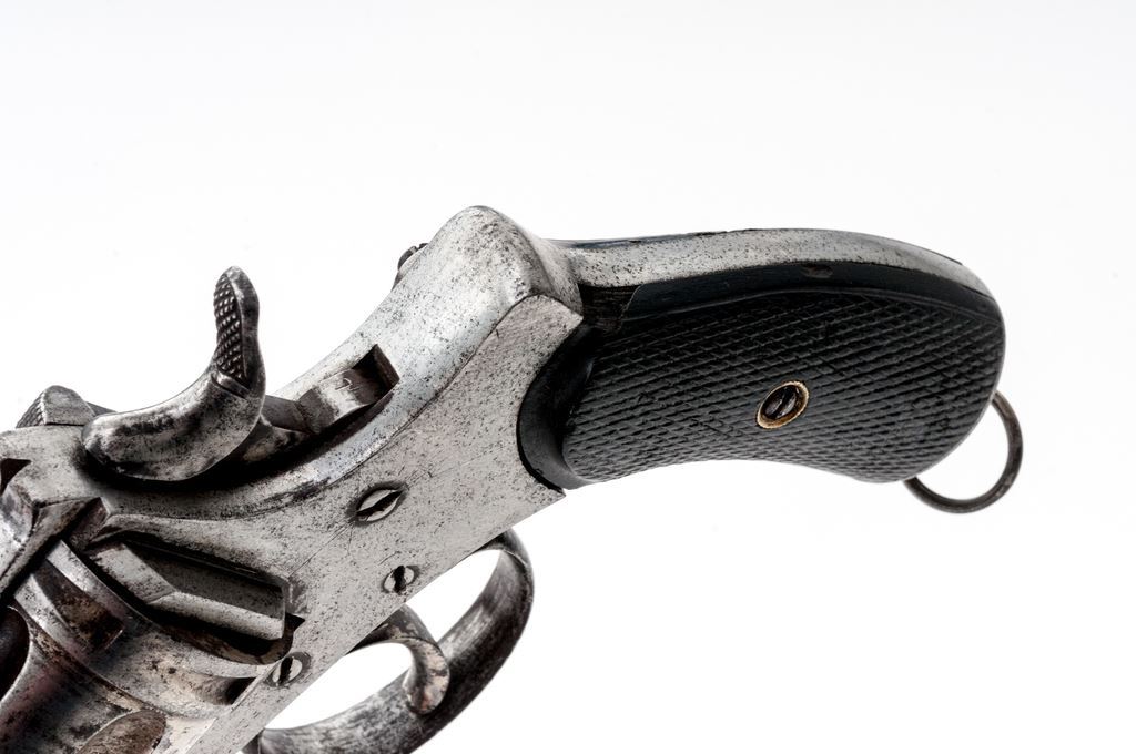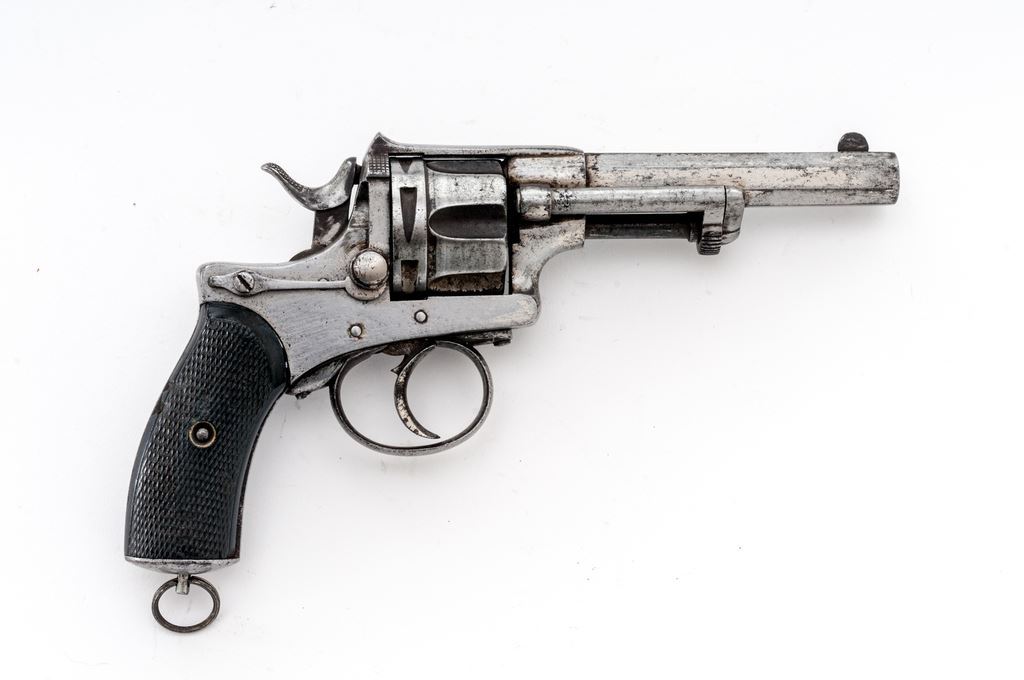 Antique Belgian Double Action Revolver, NVSN, 10mm CF cal., 4.5" octagonal barrel marked "De Beaumont/Maastricht" on topstrap, has right-side pivoting ejector rod; fluted 6-shot cylinder has "ELG/(star)" Liege proof mark at rear; solid frame has right-side hinged loading gate, separate loop trigger guard, integral grip straps with lanyard ring at oval butt, checkered 2-pc. varnished walnut grips. Mfg'd ca. 1880. Condition is good having been cleaned, retaining traces of blue and case colors. Grips are sound showing light wear, chip at top-left, and two dings at right rear. Action functions but trigger does not return, bore is bright showing light frosting and sharp rifling. Est.: $300-$400. (Antique)