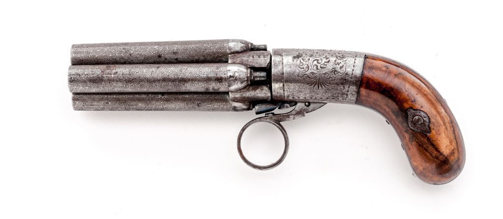 Antique Belgian Mariette Brevete 4-Barrel Ring-Trigger Percussion Pepperbox, #111, 8mm, 3" round Damascus-pattern screw-off barrel group marked with "ELG/(star)" Liege proof mark between two nipples, "1" thru "4" over each bore and rotating breech; floral-engraved frame marked "13" at top, "111" and "Mariette/Brevete" on integral inner gripstrap, has ring trigger and underhammer, varnished bag-style walnut grips with winged screw escutcheons. Mfg'd ca. 1840s-50s. Condition is very good retaining no original blue being overall gunmetal gray; grips are smooth with a few tiny marks and most original finish. Edges, markings and engraving are sharp. Action is crisp; smoothbores are clean with frosting, have muzzle notches for removal wrench. Est.: $350-$500. (Antique)