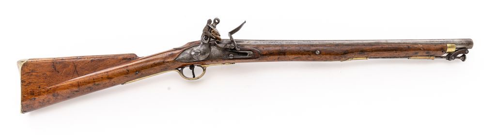 Antique British Flintlock Sling-Ring Carbine, NVSN, .69 cal., 20" round barrel without sights, marked "I" at cannon-turned breech; rounded lockplate with long tail is marked "(large crown)" over "JLR" (?) at center, "Porto/1802" vertically behind, has reinforced cock, integral pan; brass furniture includes trigger guard with finial terminals marked "R3/E/62" on loop, buttplate with faceted and scalloped top tang, serpentine sideplate, nosecap and two ferrules retaining the button-tip hinged stirrup ramrod; stock of varnished walnut has slender wrist and comb, large oval apron at top tang, raised panels at both sides of lock, 9.5" sling bar and ring at left side. Mfg'd ca. 1802. Condition is very good, the steel parts being gunmetal gray showing scattered discoloration and light etching to barrel, brass is cleaned bright. Stock is sound showing light-to-moderate nicks and marks of age and use and later varnish. Action is crisp, smoothbore shows overall cleaned heavy erosion. Est.: $1,000-$1,500. (Antique)