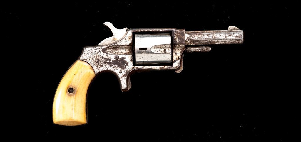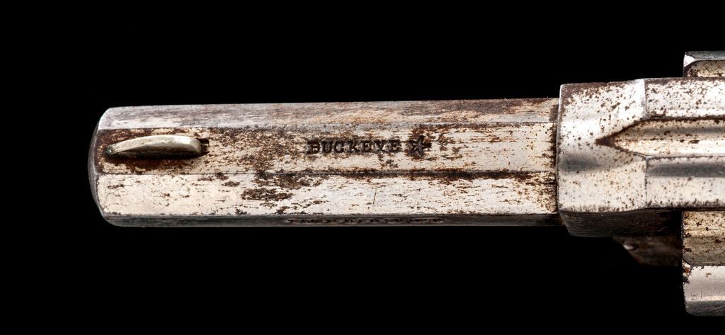 Antique Buckeye "Saturday Night Special" Spurtrigger Pocket Revolver, #5752, .30 RF cal., 2.5" octagonal barrel with blade front sight, is marked "Buckeye" on top flat, and "Pat'd. Apr. 23, 1870" on left; fluted 5-shot round cylinder; solid frame with long sighting groove on topstrap, raised circular sideplate on left, and integral spurtrigger sheath and grip straps; smooth two-piece bovine bone grips. Mfg'd. 1870s-80s, originally with full nickel plate finish. Condition is good. Metal surfaces retain approx. 50% original nickel, with scattered losses and discoloration (especially on right side); grips are smooth showing light age but no cracks or losses; edges and markings are sharp. Action is smooth but does not revolve cylinder; bore is clean with overall frosting and defined rifling. Est.: $70-$120. (Antique)