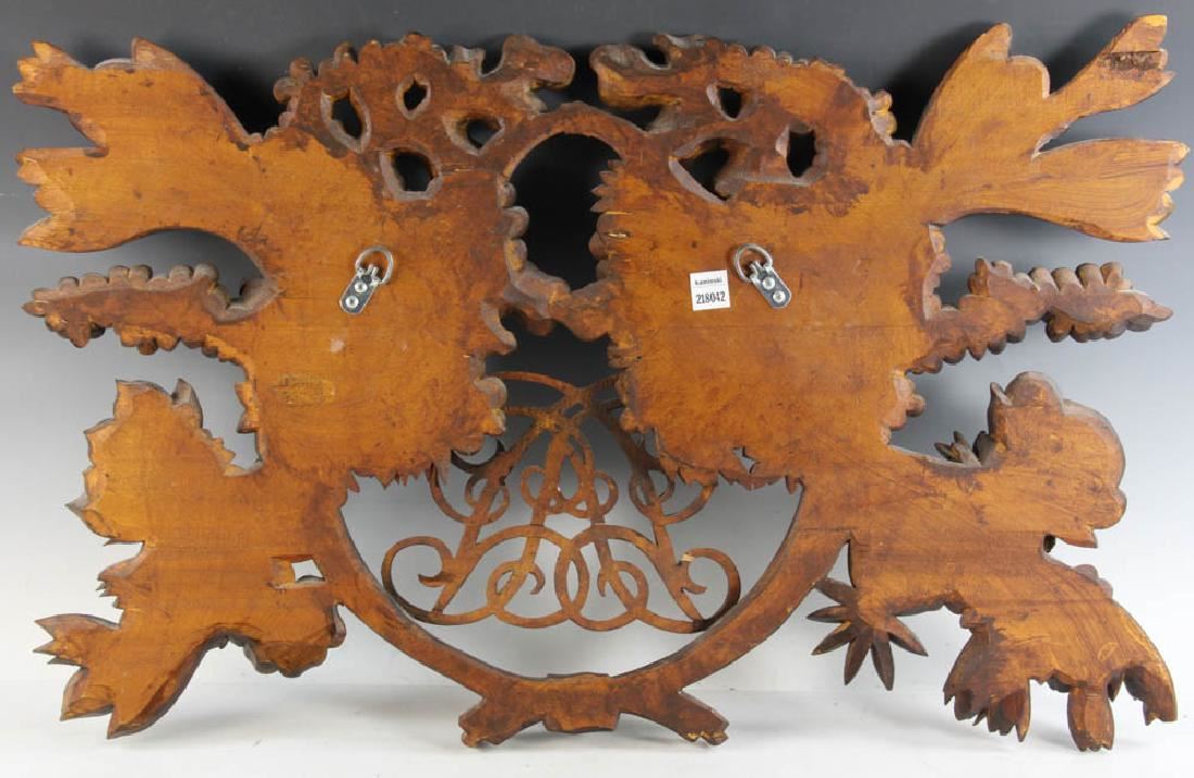 Antique carved wooden wall plaque, oak leaves, acorns, and florals with initials, 21 1/2" H x 30" W (overall). Provenance: Vero Beach, Florida estate.