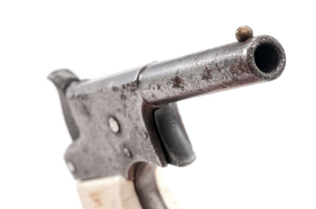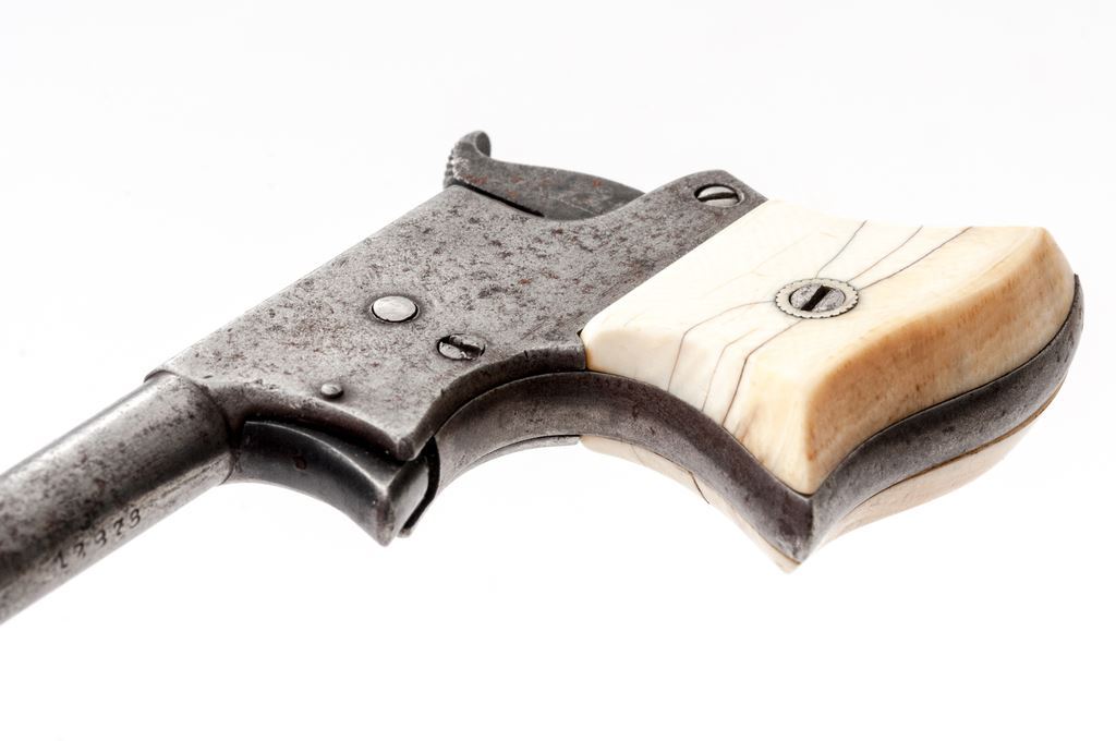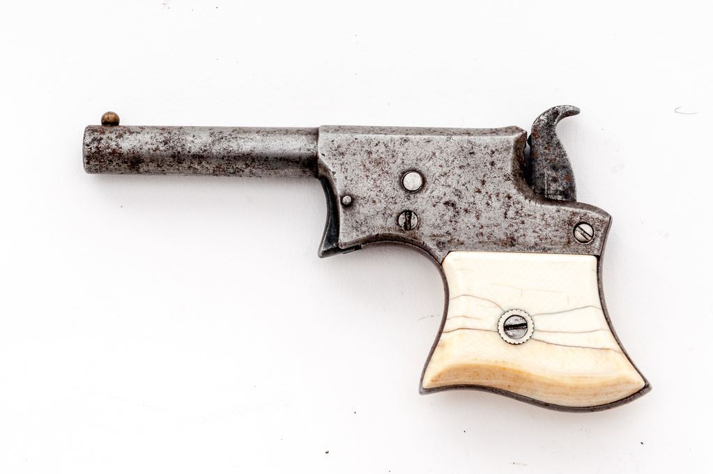 Antique Cased Remington No. 1 Vest Pocket Single Shot Derringer, #12873, .22 RF cal., 3.25" round barrel marked with maker's name and address and 1861 patent date on top flat, made integral with unmarked "saw-handle" frame; 2-pc. ivory grips. Mfg'd ca. 1865-88. Condition is very good retaining no blue but gunmetal gray with scattered discoloration, good edges and markings. Grips show pleasing light cream color with secure horizontal stress cracks at screws. Action is crisp, bore with overall moderate roughness and faint rifling. Modern walnut display case is lined in gray chamois cloth and is in fine condition overall Est.: $300-$500. (Antique)
