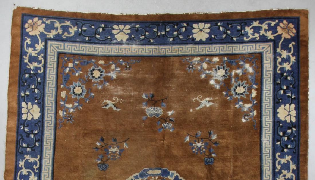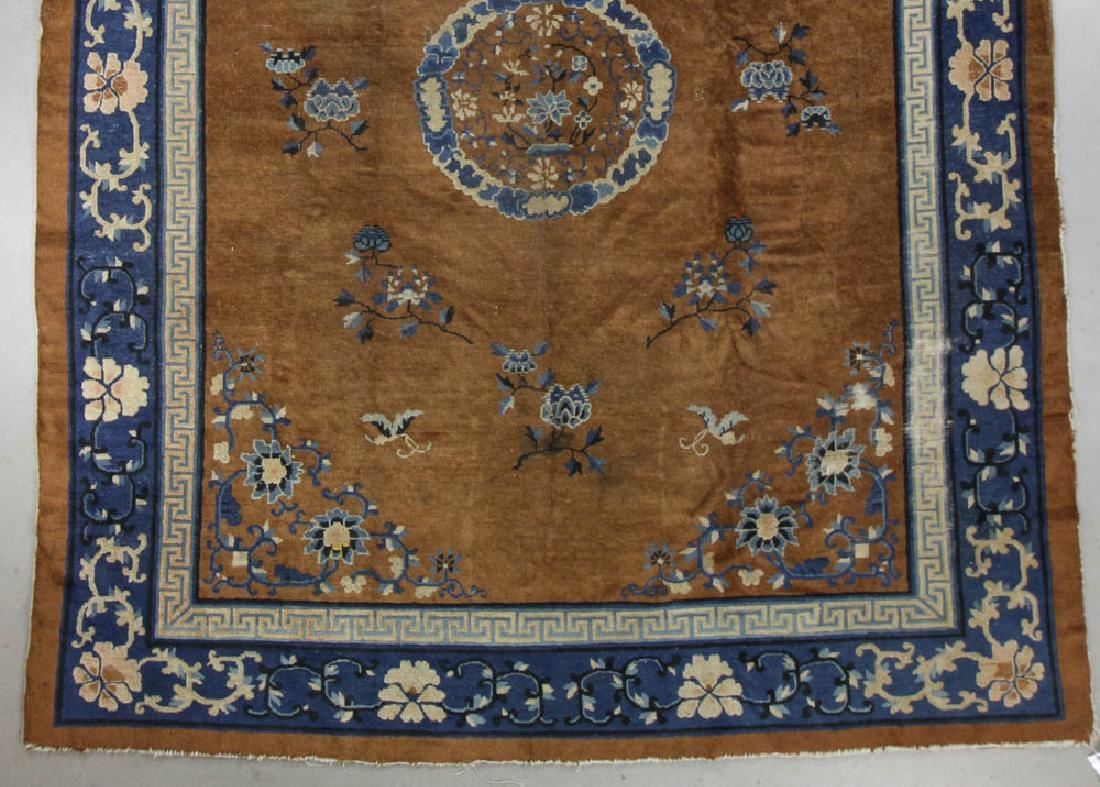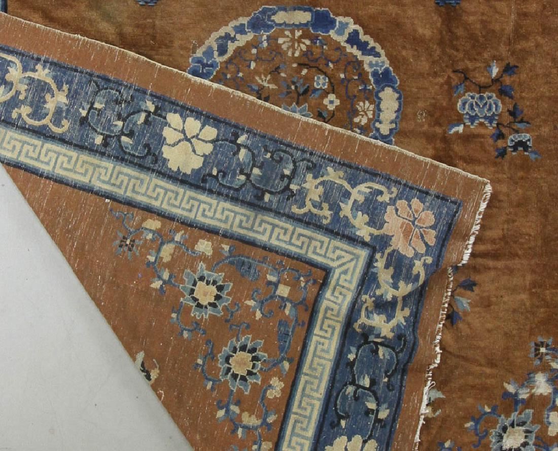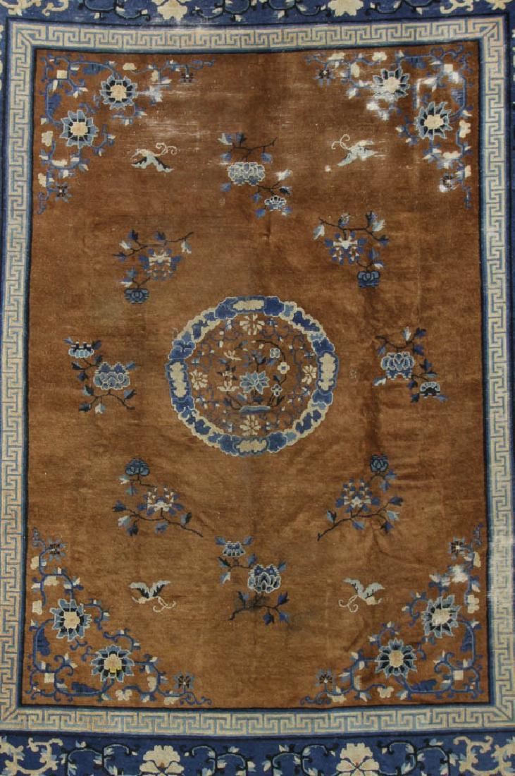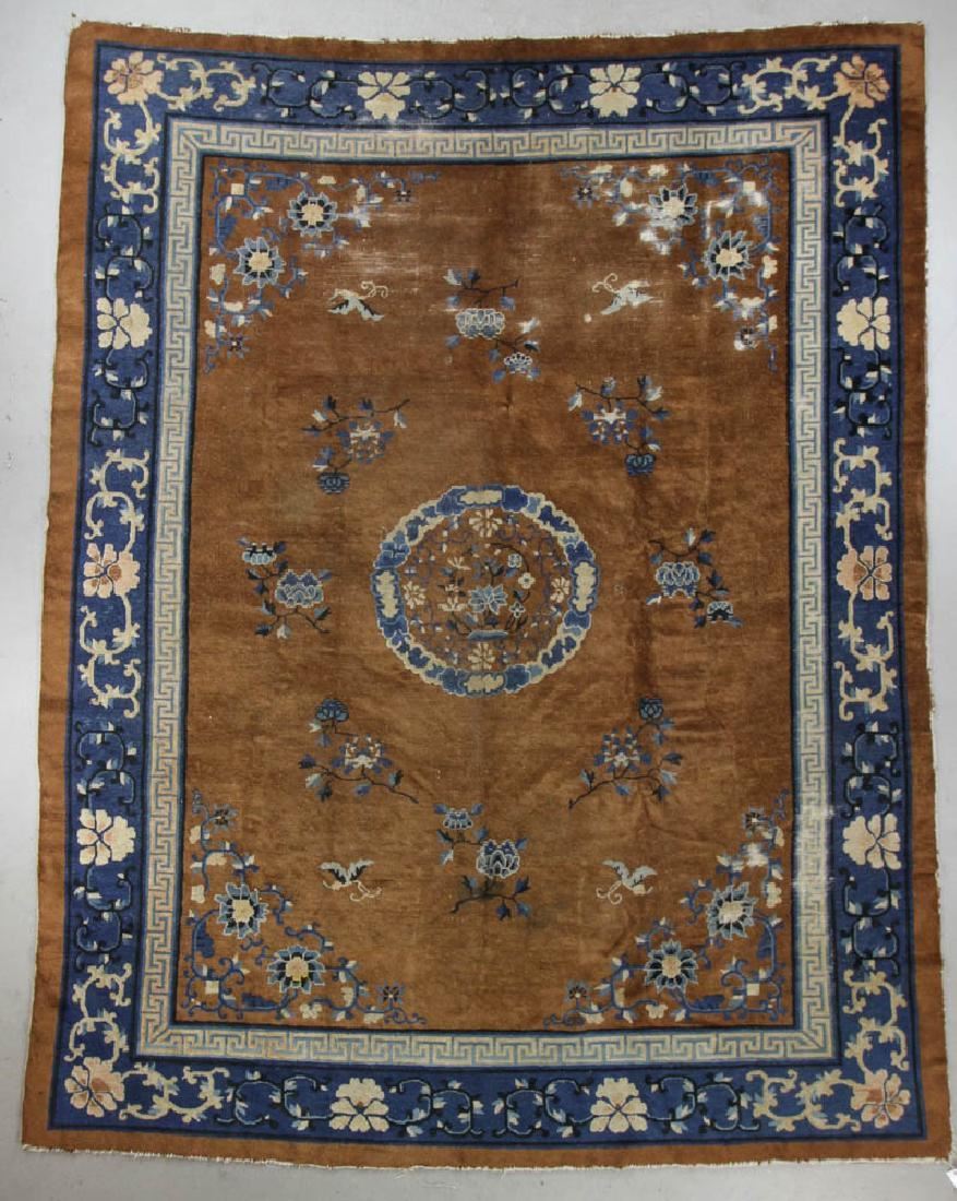 Antique Chinese Peking rug, brown field with blue border, 8' 11" x 11' 5". Provenance: West Palm Beach, Florida estate.