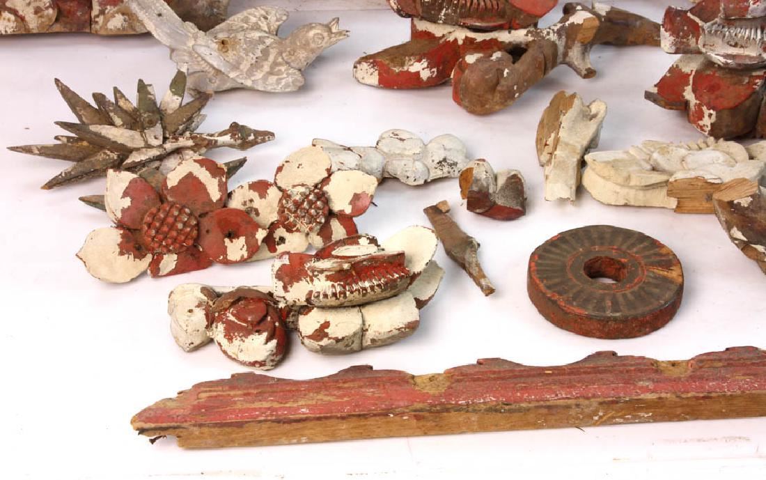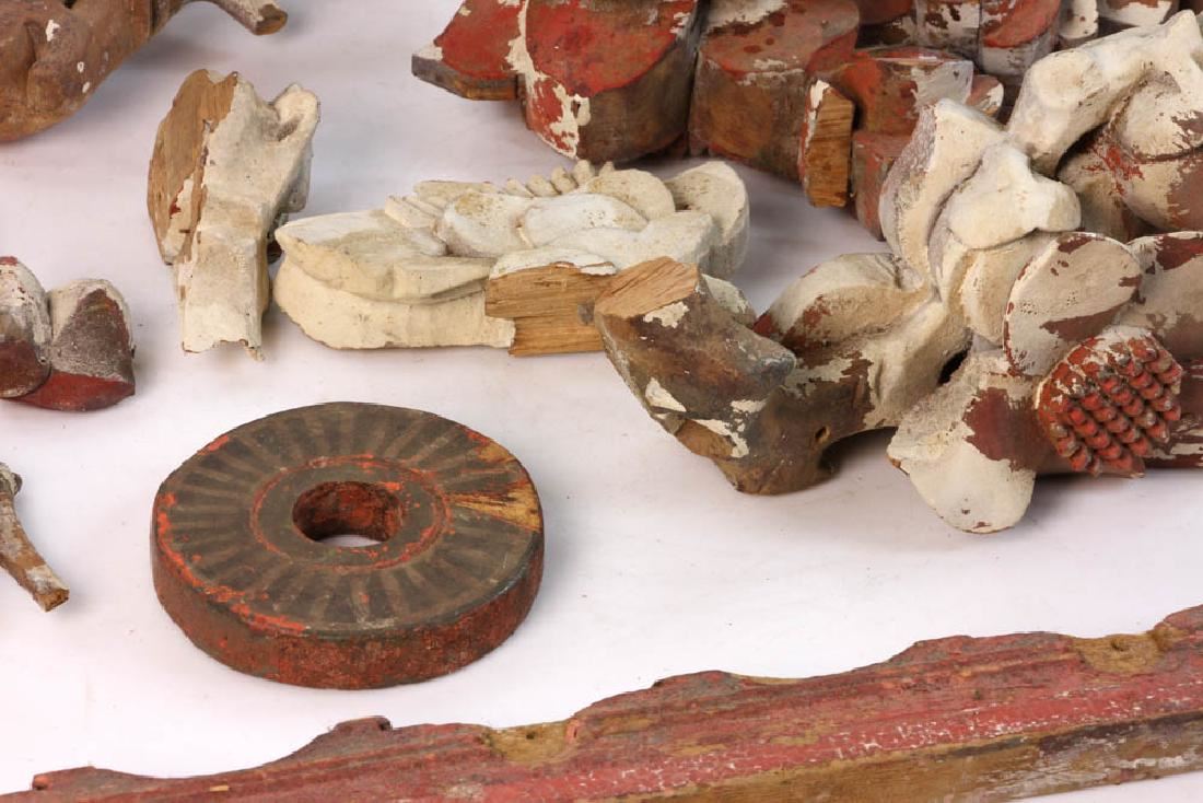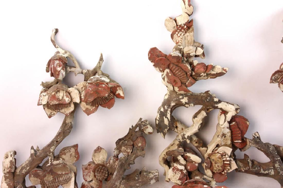 Antique Chinese wood carvings box lot, with three old stencils, 18" x 47".