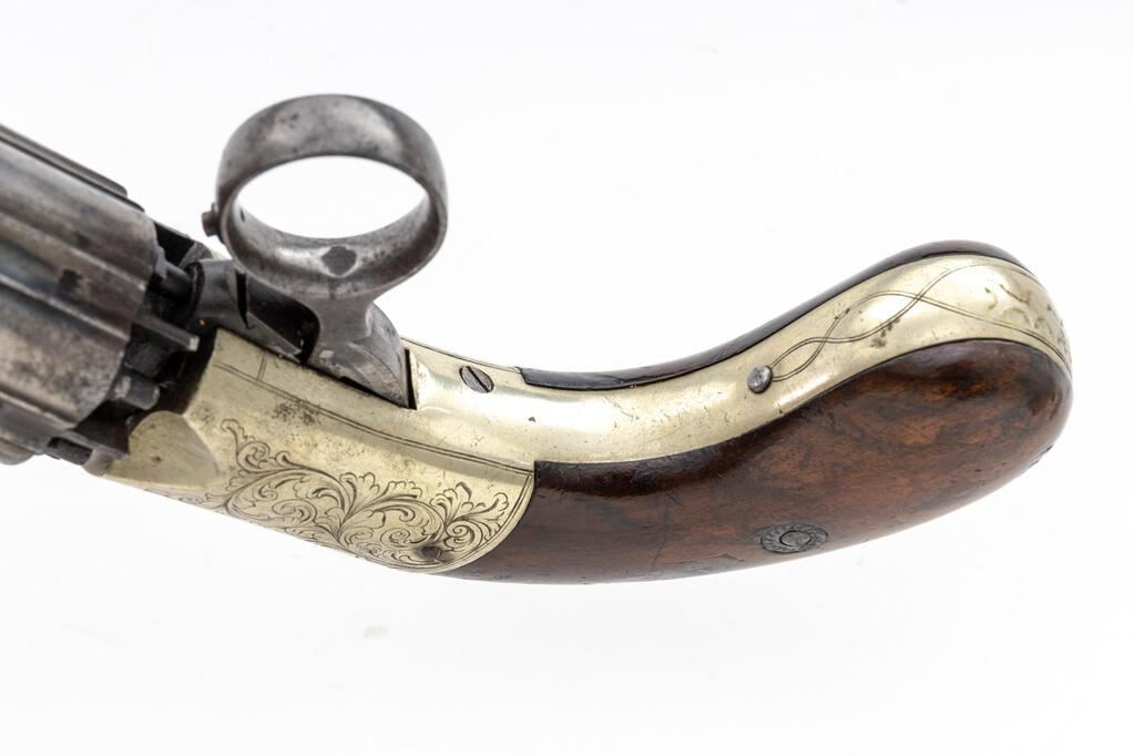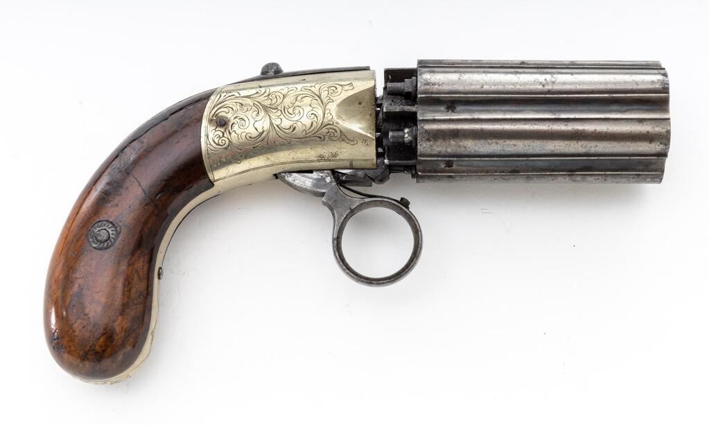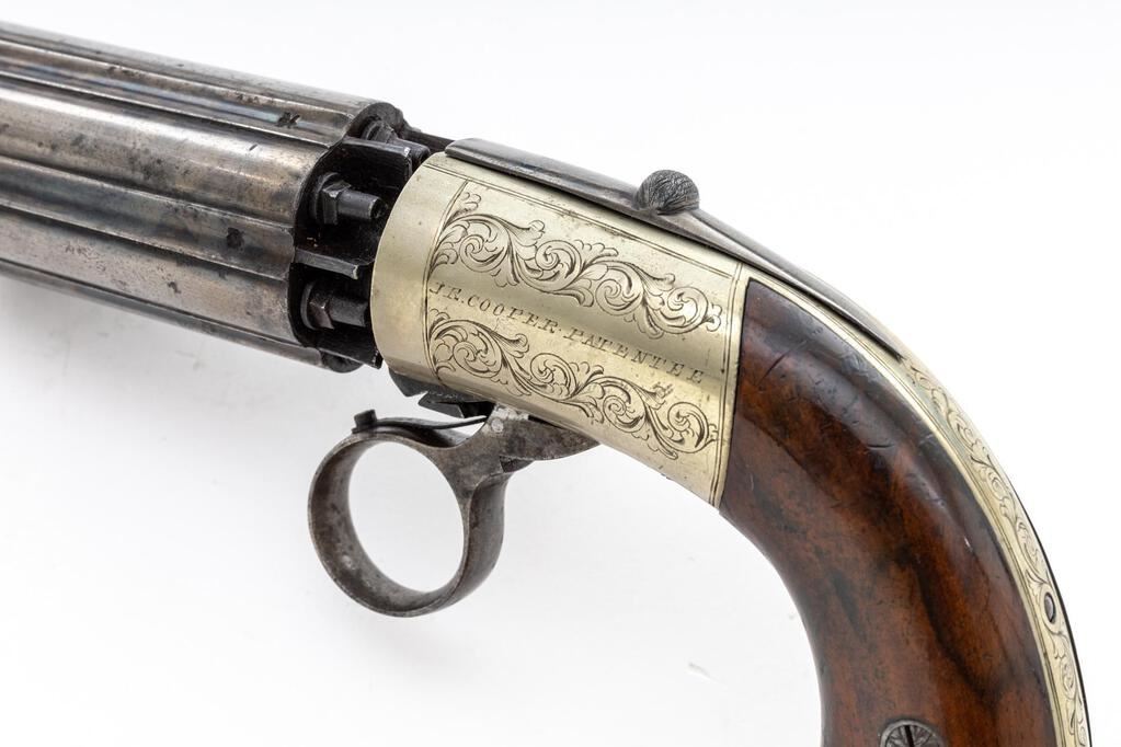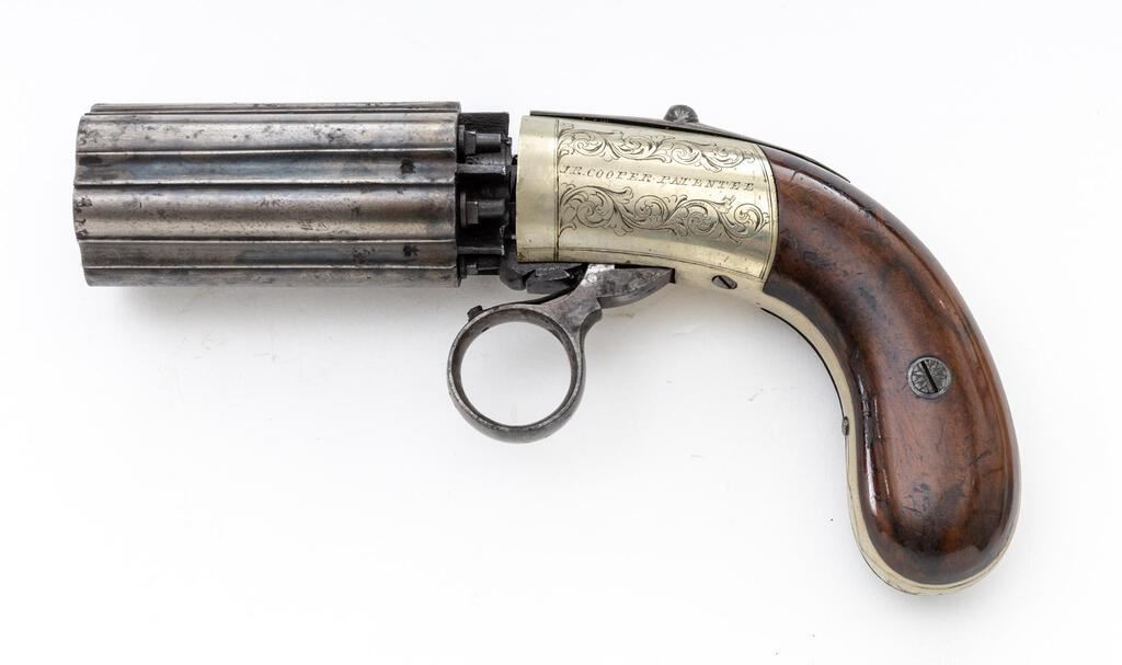 Antique Engraved English Double Action Ring-Trigger Percussion Pepperbox, with German-Silver Frame, by Joseph R. Cooper of Birmingham, NVSN, .38 cal., 3.25" 6-shot fluted barrel group has Birmingham proofs on ribs between bores; frame is marked "J.R. Cooper Patentee" at left, has floral engraving, ring trigger and striker underneath, top sliding safety, integral gripstraps and varnished walnut "bag-style" grips. Mfg'd ca. 1840s-1850s. Condition is very good retaining most blue to barrel flutes, the balance with traces of blue and smooth metal, frame with sharp engraving (light wear at butt). Excellent grips show occasional dings and most original finish. Edges, markings and engraving are sharp, nipples are unbroken. Action is crisp, smoothbores are clean. Est.: $600-$900. (Antique)