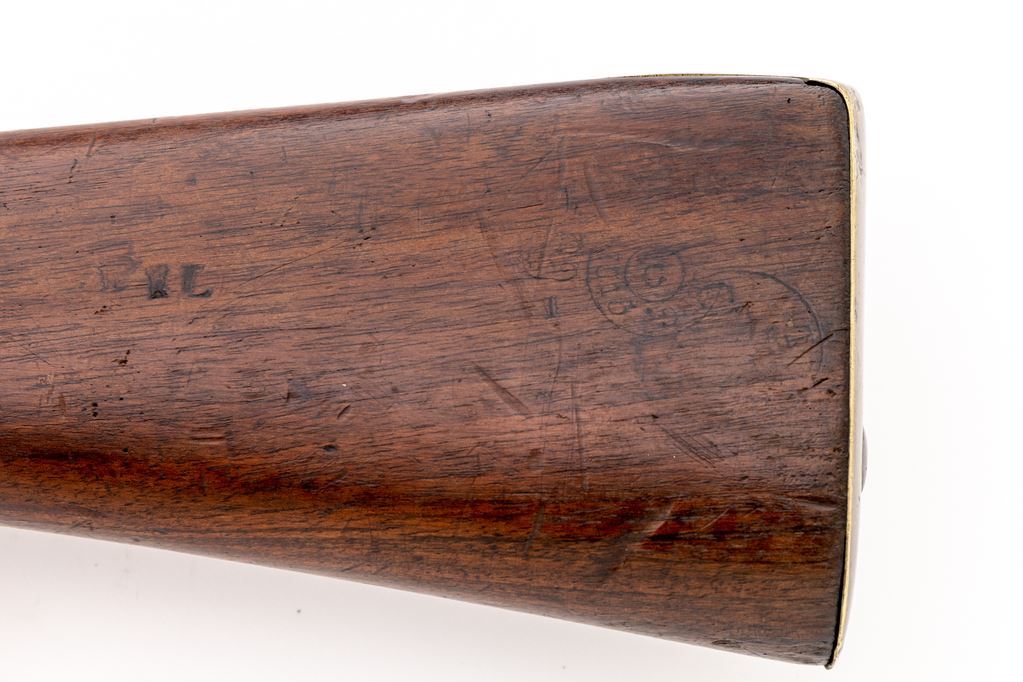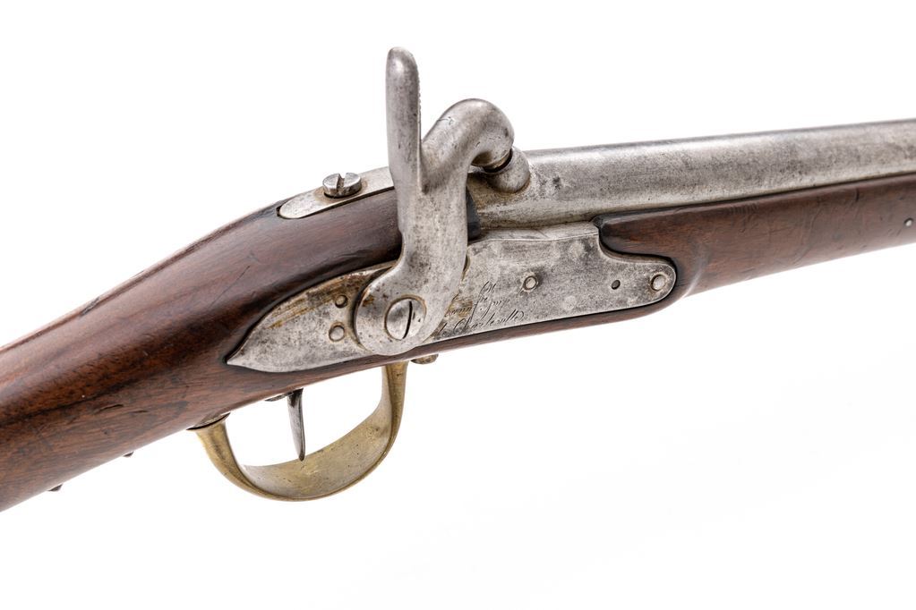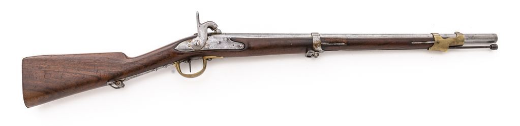 Antique French Percussion Musketoon, by Charleville Arsenal, Altered from Flintlock, NVSN, .69 cal., unmarked 24.5" round barrel made without rear sight; beveled lockplate with rounded tail is marked "Cann Mre. Mp le/de Charleville", has hammer with tall spur; brass furniture includes trigger guard having steel lower tang with 2 finger grips and sling loop at rear, buttplate, serpentine sideplate marked "P-F", spring-retained double-strap nosecap/top band with integral front sight holding the steel tulip-tip ramrod; oil-finished walnut fullstock has .5" inlet roundel at right, several stamped letters/numbers and 2 military cartouches at left, spring-retained lower band with sling loop. Mfg'd ca. 1820s, altered ca. 1860s. Condition is good with bright metal having light toning, fine edges and markings. Stock is sound showing occasional marks, a 2.25"x.5" wood patch above the rear band spring on both sides, a .75" shallow wood loss in the ramrod channel, and a 4.5" repaired crack at left of top band; nipple is a modern replacement. Action is crisp, smoothbore is clean with overall light pitting. Est.: $600-$900. (Antique)