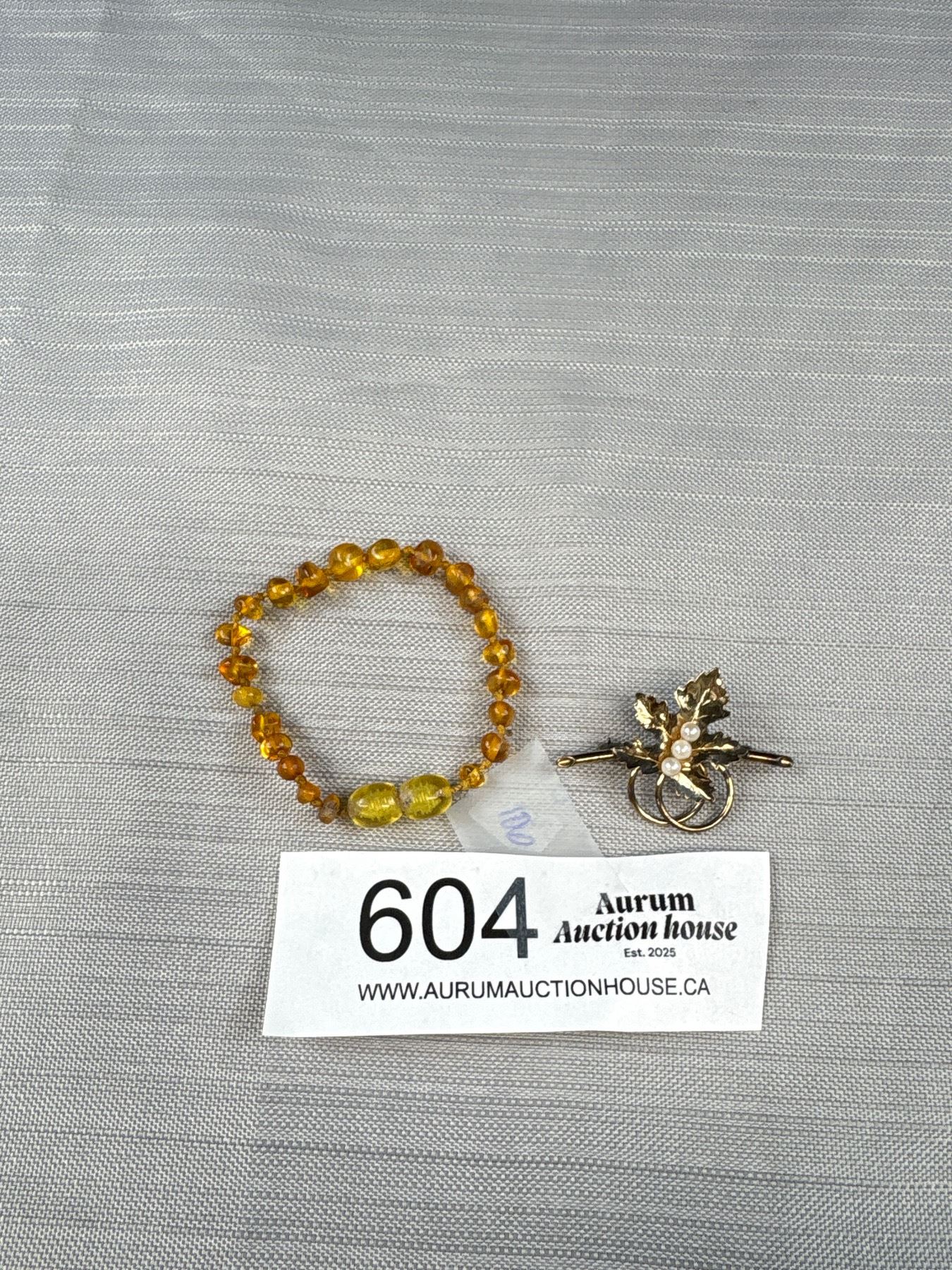 Antique Genuine Amber Genuine Pearl Brooch Bracelet Excellent!