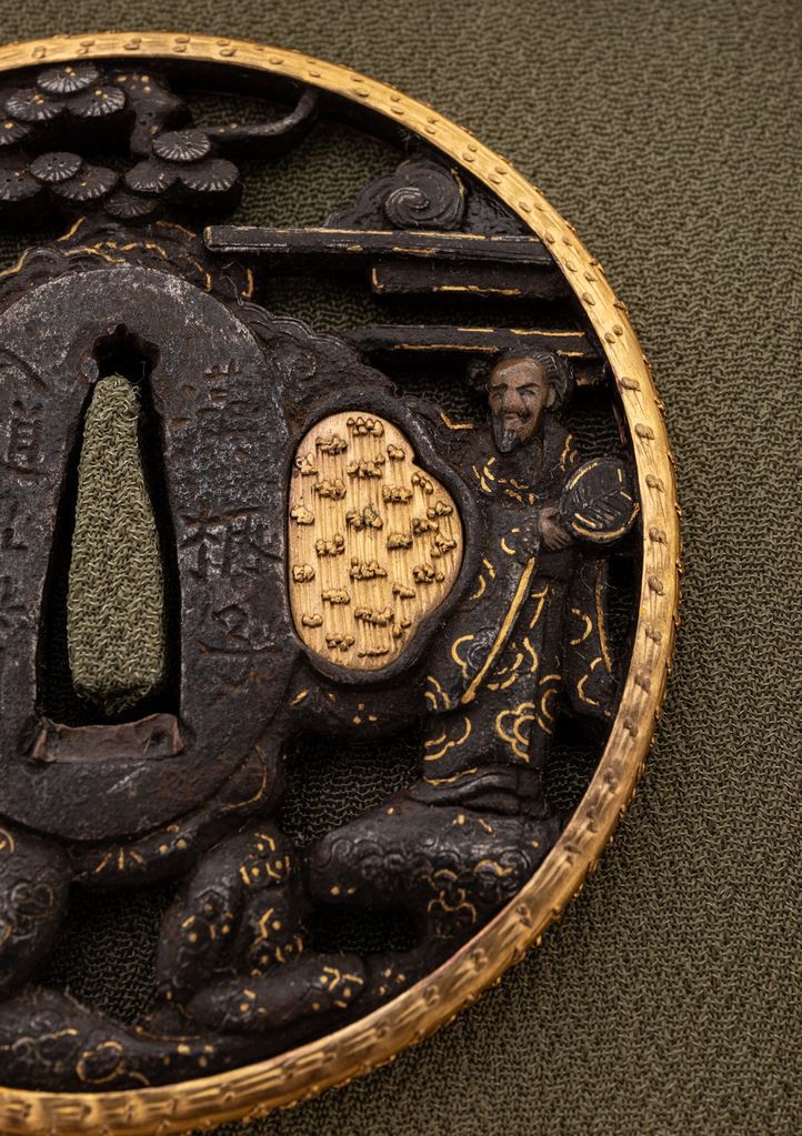 Antique Japanese Iron Tsuba, Soten School - People & Pine Trees, Signed. Nice small round iron sukashi tsuba with gold rim, typical of the Soten School of tsuba design. The theme is a man with a fan standing under a roof, with pine tree branches and needles surrounding him; the reverse has a small man near the pine tree trunk and rocks. The men have copper faces with gold-inlaid designs in their kimonos. Pine branches and needles have small gold inlaid highlights. There is a solid gold rim applied to the outer edge of the tsuba that has carved and raised designs, like rain drops or cat scratches. There are kozuka and kogai anas (holes) on either side of the nakago that are filled with gold plugs having the same carved and raised designs as the rim. The pierced designs are well executed and carved. There is a multi-character signature covering both sides of the seppa dai area around the nakago ana (tang hole) front and back. There is a copper sekigane inside the nakago ana, showing this tsuba has been fitted to several swords over its lifetime. The tsuba measures 74mm round. Condition is excellent for its age, the iron with a nice dark patina, with some light rust speckling in the recesses. There are minor losses to the gold inlays on both sides and light wear to the copper faces of the men. Circa mid-18th to mid-19th Century. Includes a wood storage box. Est.: $450-$600.