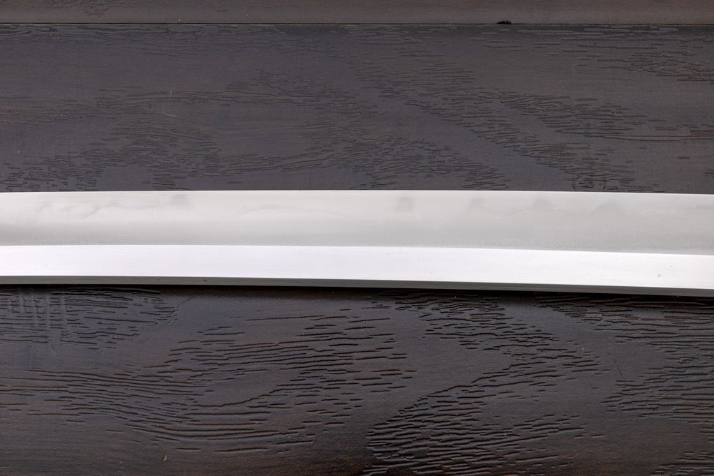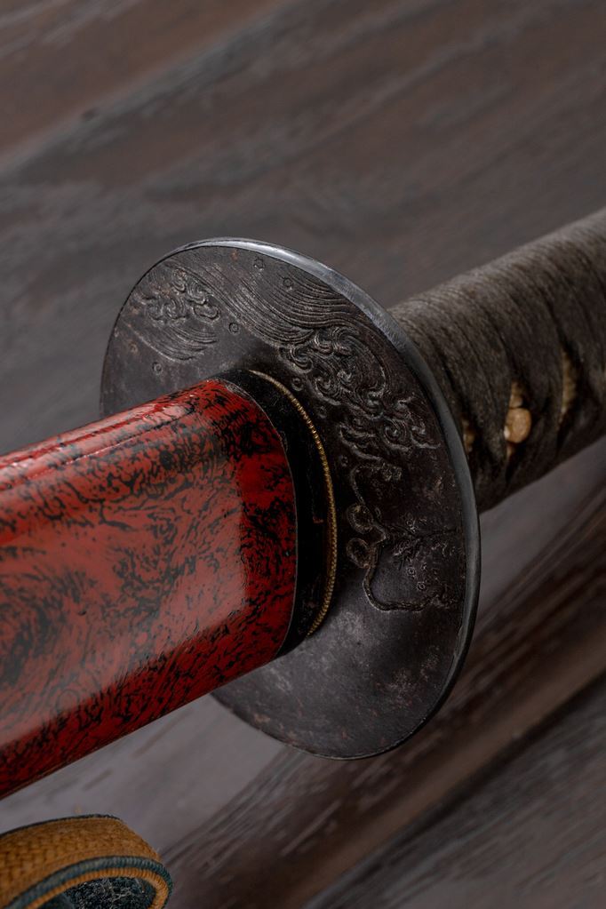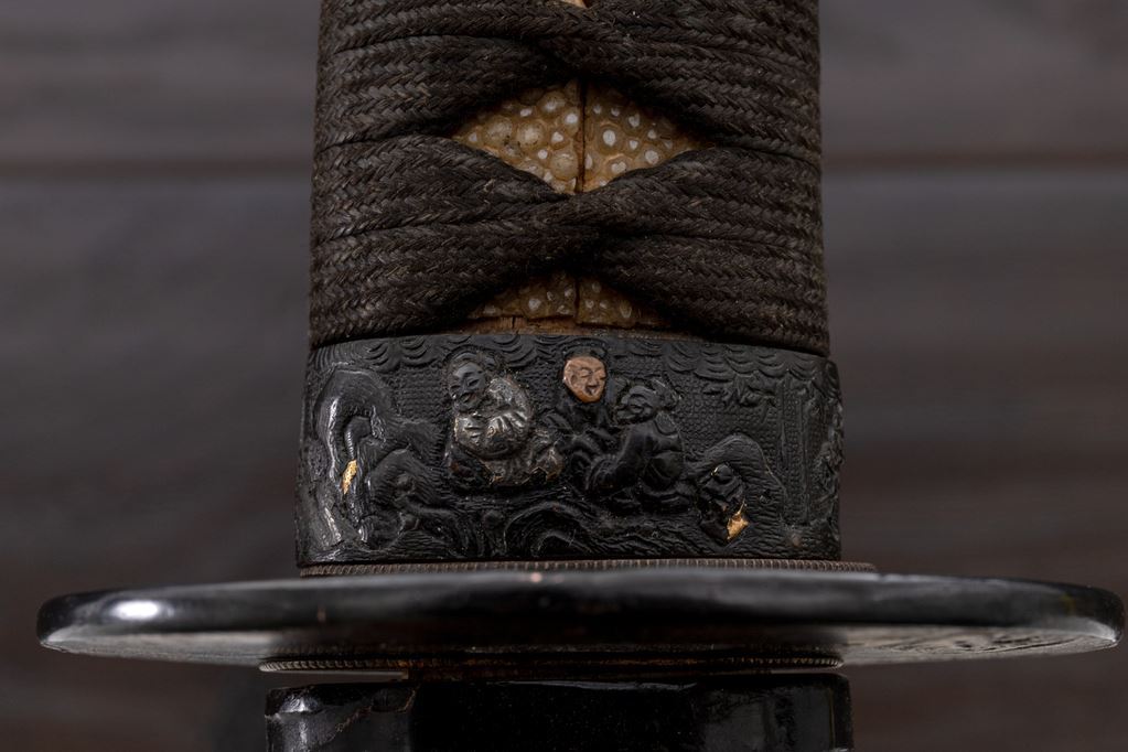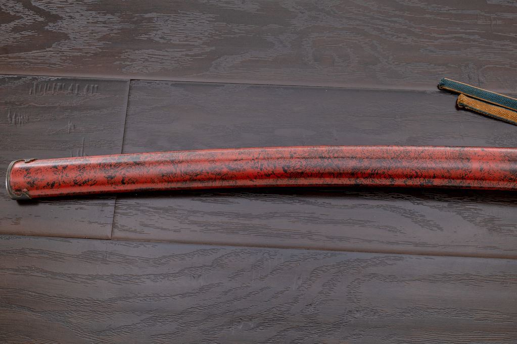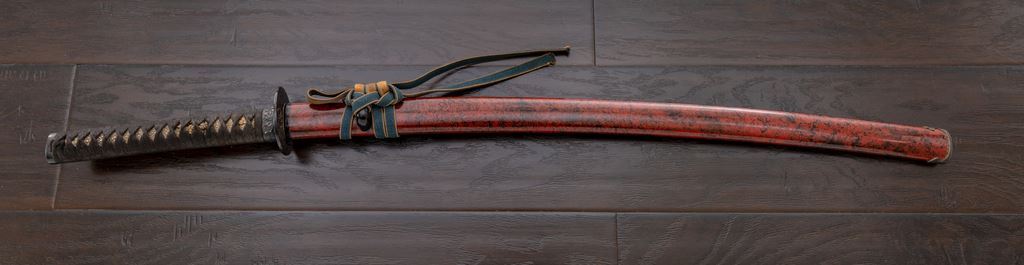 Antique Japanese Katana w/Koshirae. Nice mumei (unsigned) shinogi-zukuri shaped katana with muji hada grain, and a billowing Toran-ba hamon of nioi and nie. It has a chu-kissaki and o-maru boshi with a short turn back. The blade length is 66.7cm or 26-1/4". The tang is ubu with one mekugi-ana hole, and dark brown patina; habaki is copper, and housed in an older shirasaya resting scabbard. It has an older NBTHK white paper from Showa 45(1970) attributing the sword to a school or particular smith. Sword looks to date from the late Shinto or Shin-shinto time period. Condition is very good, the polish probably done around the same time as the paper, and there are a few very light blemishes to the surface, a few very light stains from thin rust that did not pit the surface, and light scratches from going in and out of the saya or mounts. The tang may have been re-patinated. The shirasaya shows old oil stains and tape marks to the outer surface, and has a small split near mouth of the saya. The koshirae consist of a red lacquered saya with mottled black designs in the lacquer, a brass kojiri at the tip with a stippled surface, and carved lines on the bottom, and a blue and brown sageo cord wrapped around the top. There are no shitodome eyelets in the kurikata. There is a pocket for a kozuka on the back side of the saya, but no kozuka is present. The tsuba is iron with a thin shakudo rim that has wave designs and a hawk carved into it, measuring 66mm wide x 74mm tall, ca. 19th Century. There is a kozuka hitsuana on one side of the nakago ana, and two small holes on the other side for a cord. Typically these small holes were to tie a cord through to the saya to prevent the samurai from drawing his sword in haste, and giving him time to think about the consequences! The tsuba is unsigned and shows light rust and evidence of cleaning to the surface. The tsuka is covered in same' ray skin and wrapped with old black silk ito cord, the menuki are gold over copper shi-shi lion dogs. The fuchi is thick and features images of men and pine trees, with gold, silver, and copper highlights. There is a signature on the bottom of the fuchi. The kashira is smooth plain shakudo. The tsuka shows age and soiling to the same' and the ito cord, but the wrapping is sound. The fuchi/kashira show some age and light wear, and light soiling. The menuki show wear to the gold overlay with some areas of copper showing through from use and handling of the sword over time. There is a wooden tsunagi holding the mounts together, that has been refitted to this koshirae. Also included is an older padded silk brocade sword bay with cord. Est.: $2,500-$4,000.