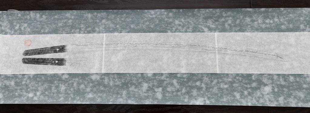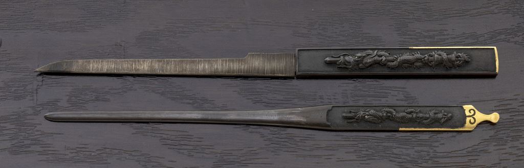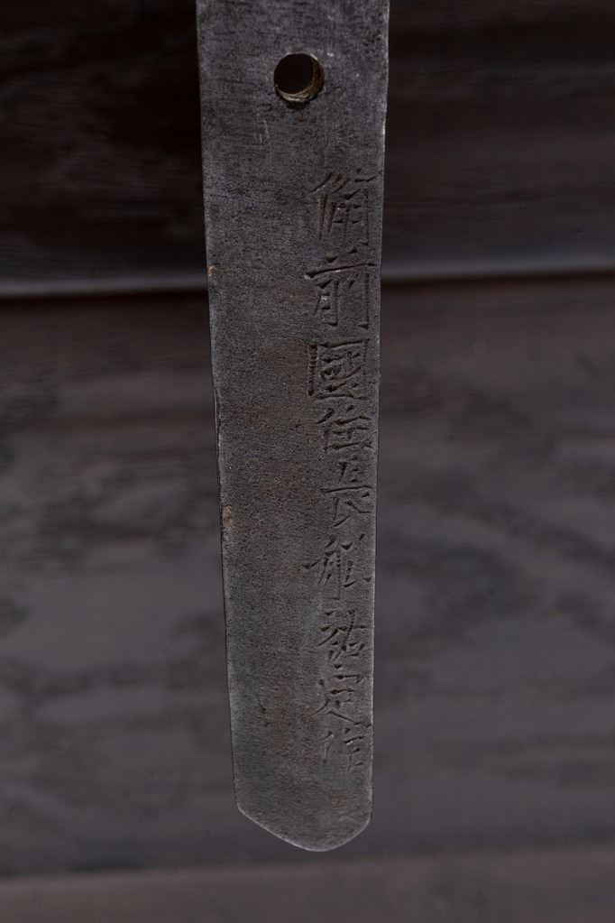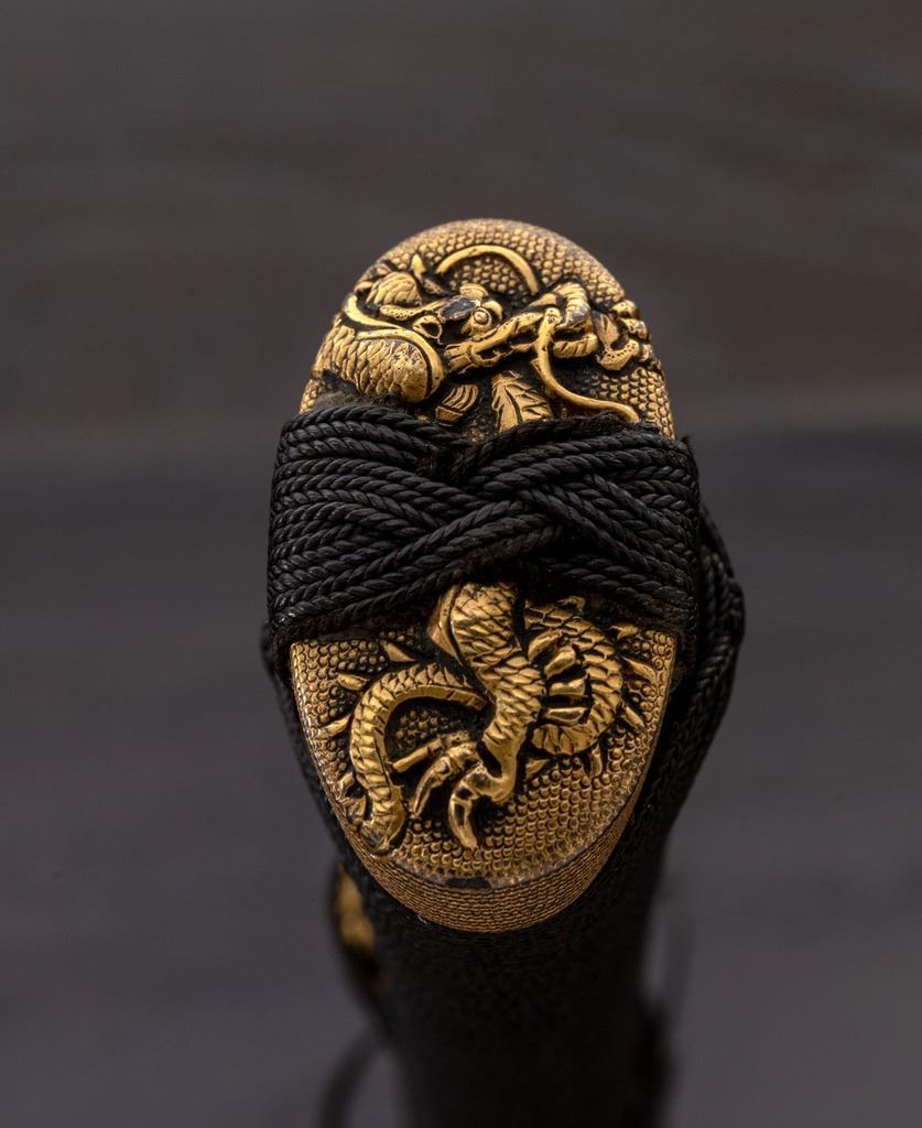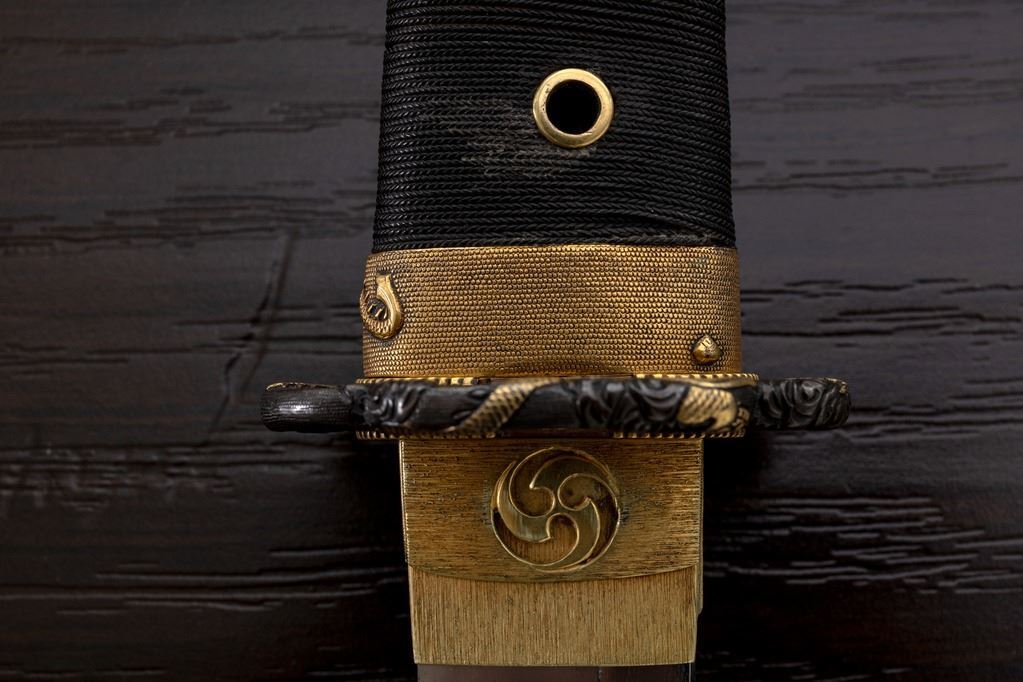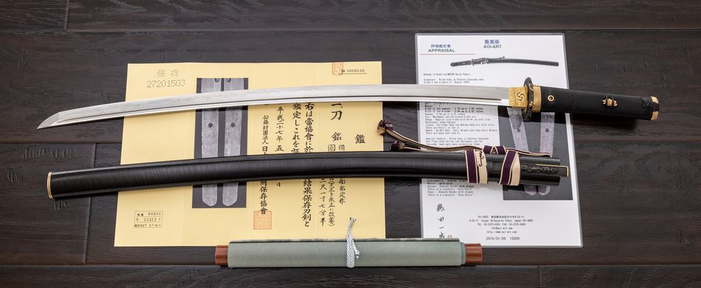 Antique Japanese Koto Sword, Signed & Dated, with Koshirae. Beautiful shinogi-zukuri katana with bohi groove, Bizen itame/mokume hada, nie deki gunome choji hamon, midare utsuri, chu-kissaki with ko-maru boshi and short turn back. Ubu nakago with one mekugi-ana, signed "Bizen Koku ju Osafune Sukesada saku", and dated August of Eisho 2(1505). Habaki is a two-piece gold foil over copper, with sukashi "night and day" comma family mons. The blade length is 66cm or 26 inches. There were many smiths that signed Sukesada, but this is of an early period, and not one of the mass produced swords. This smith ranks highly, with a JoJo saku rating. It comes with a NBTHK paper dated Heisei 27 (2015) verifying the signature is genuine. It also has a information fact sheet from a Japanese sword dealer dated 2016, and a full-length oshigata rubbing of the blade wrapped in a scroll. Condition is excellent, the sword in a nice state of polish showing a clear hada grain and hamon. There are minor folding lines in the grain in a couple of areas. The nakago has a nice dark black patina, showing some old pitting, but with a clear signature and date. The koshirae consists of a black lacquered saya with alternating bands, and copper-colored bands appearing within the lacquer. The kojiri is smooth gold over copper. The koiguchi is black horn. There is a purple and white woven silk sageo cord with woven images of water dragons, that is tied around the saya. There are pockets for kozuka and kogai. The kozuka is shakudo and gold with a shakudo nanako plate featuring a black dragon climbing a ken and vajra. It is signed on the back "Goto Denjo". The ko-gatana looks modern, possibly silver. The kogai is a matching piece of shakudo and gold with a shakudo nanako plate and black dragon climbing a ken and vajra. It is also signed "Goto Denjo". They both show wear and age, with light scratches and minor dings. The Tsuba is a mokko-shaped shakudo nanako piece with gold dragons and clouds around the rim area. It measures 54mm wide x 59mm tall. It is signed "Goto Mitsuharu" w/kakihan. There are kozuka and kogai hitsuanas on either side of the nakago ana, showing wear to the patina on the shakudo body. There is no documentation as to the signatures on the fittings. The seppas are gold foil over copper and show some wear. The tsuka is wrapped with thin black string, and has small gold flower menuki. It has gold eyelets for the mekugi. The fuchi and kashira are gold over copper with a nanako surface and feature a male dragon on the fuchi and female dragon on the kashira. They are not signed. A very attractive sword and mounts that would display very well. Est.: $5,000-$8,000.
