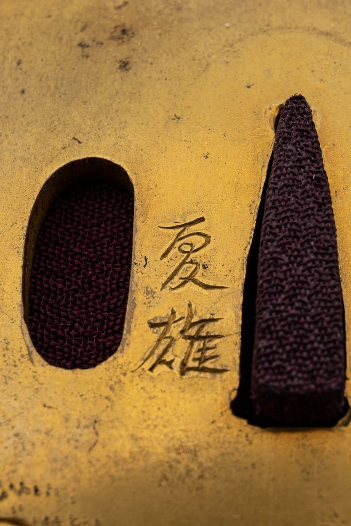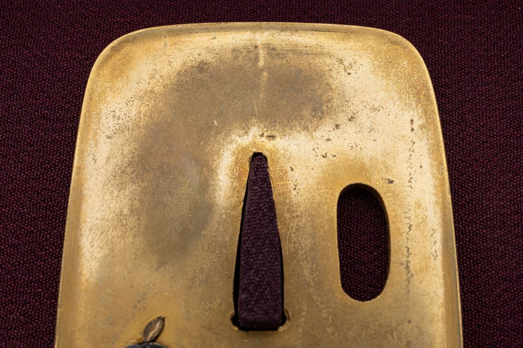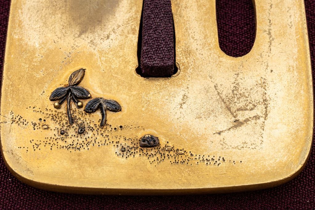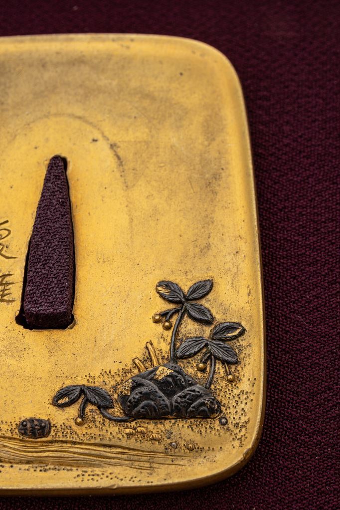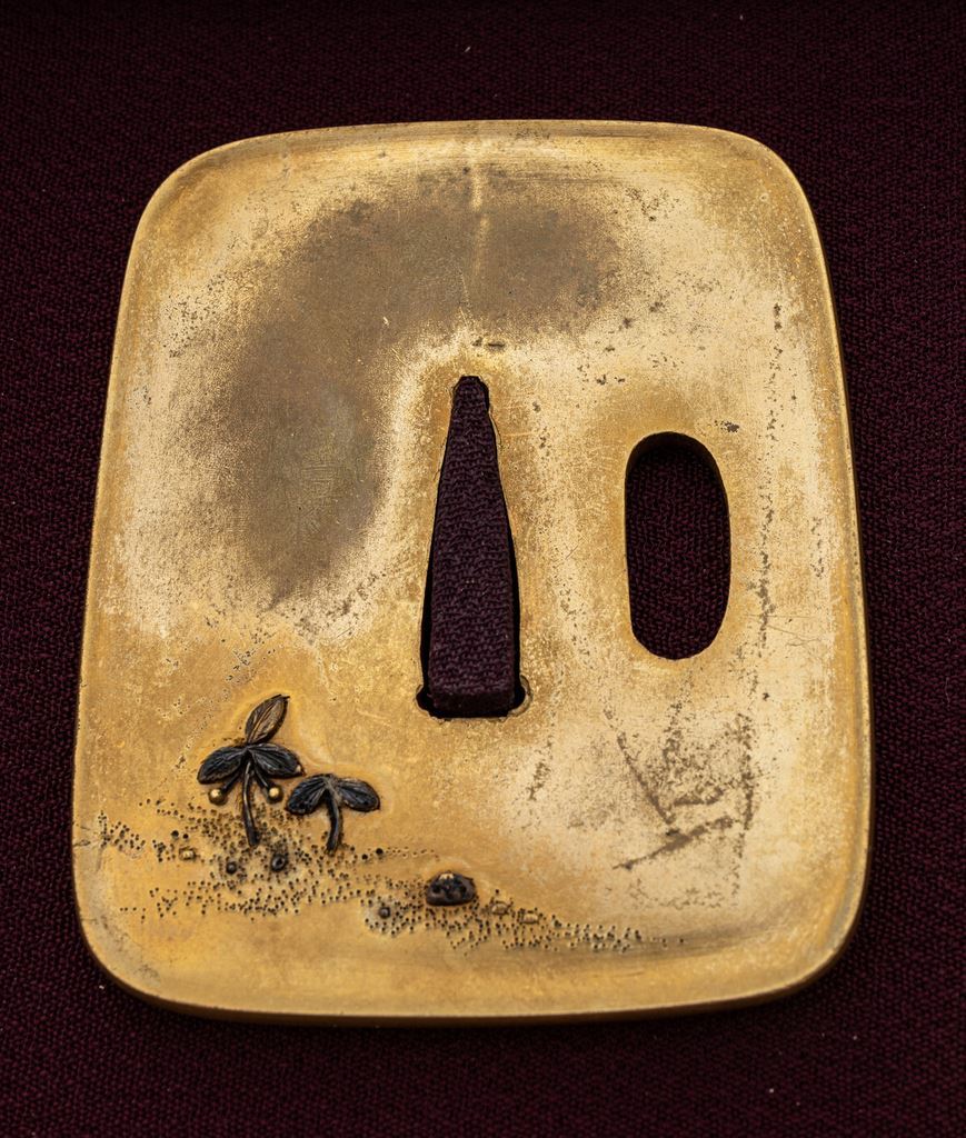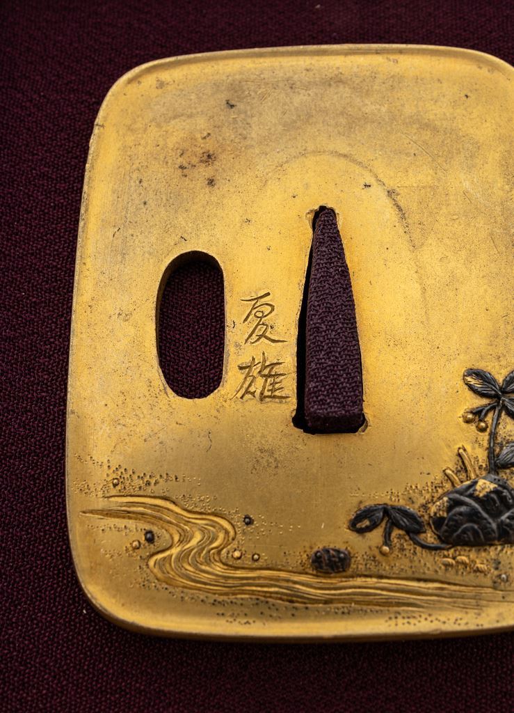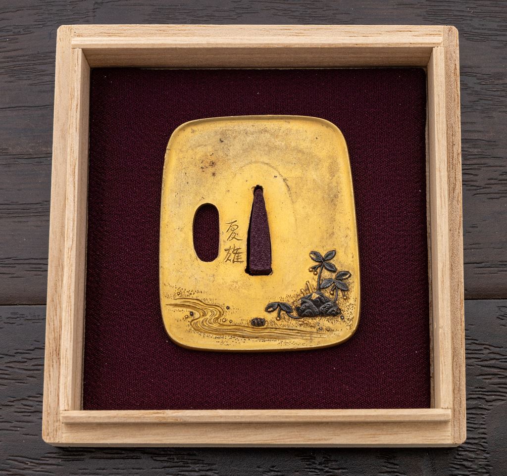 Antique Japanese Soft Metal Tsuba - Stream & Plants, Signed. Small Antique Japanese rectangular-shaped tsuba made of soft metal, covered in gold, with a scene of a stream, rock, and plants. Rocks and plants are done in shakudo with gold highlights; the reverse features a stream bed with rocks and similar plants done in shakudo with gold. There is a kozuka ana hole next to the nakago ana hole for the tang. The rim of the tsuba is raised above the surface giving it a pleasant appearance. There is a two-character signature carved next to the nakago ana, and measures 67mm x 55mm. Condition is very good, the gold-covered surface showing thinning in some areas, mainly on the reverse side. There are some very tiny dings to the sharp edges of the rim, showing evidence of being mounted for use, and minor wear from use. Circa early to mid-19th Century. Includes a wood storage box. Overall a very nice tsuba. Est.: $300-$400.