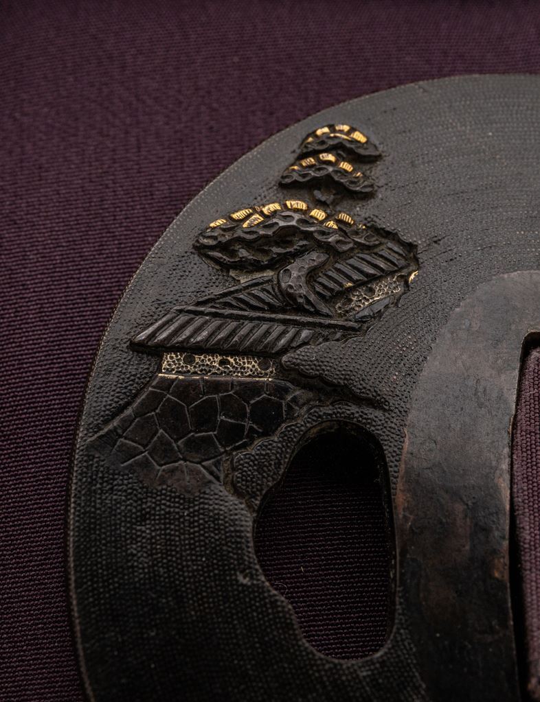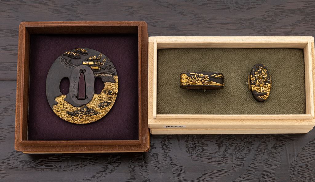Antique Japanese Soft Metal Tsuba and Fuchi/Kashira - Samurai & Waves, Signed.. Small soft metal tsuba made of shakudo with nanako (stippled surface), and fuchi/kashira set of fittings for the tsuka (sword handle). Fittings depict a battle between samurai defending a castle, samurai on horseback and samurai swimming in waves. The tsuba has raised decorations of pine trees, samurai, castle, waves, and samurai in the waves on the front, and the same castle with a samurai on the ground on the reverse. Waves and samurai have inlaid or applied gold and silver to highlight and define the details. There are kozuka and kogai anas on either side of the nakaga ana. The tsuba has a carved signature next to the nakago ana and measures 70mm x 65mm. The fuchi features a samurai on horseback with bow and sword, in waves, a bridge, and pine tree. The kashira features a similar samurai on horseback with the bow string in his mouth, on shore next to the waves. The fuchi/kashira set are also made of shakudo/nanako, with gold inlaid and applied to highlight the features. While they are of the same theme, the tsuba and fuchi/kashira set may not have been made by the same hand. The fuchi/kashira set have a little better workmanship and detail than the tsuba. But, once mounted on a sword, they would complement each other very nicely. Condition is excellent, the tsuba having nice dark patina, not showing much wear, with just a couple of small dings on the reverse side. The fuchi/kashira set are also excellent, showing a dark patina, very little wear, and excellent detail to the features. Circa early to mid-18th Century. Includes a wood storage box for the tsuba and a box for the fuchi/kashira set. Est.: $700-$900.