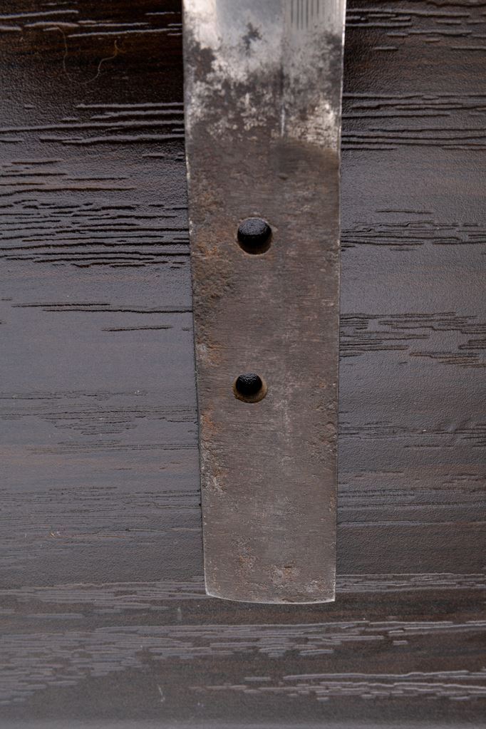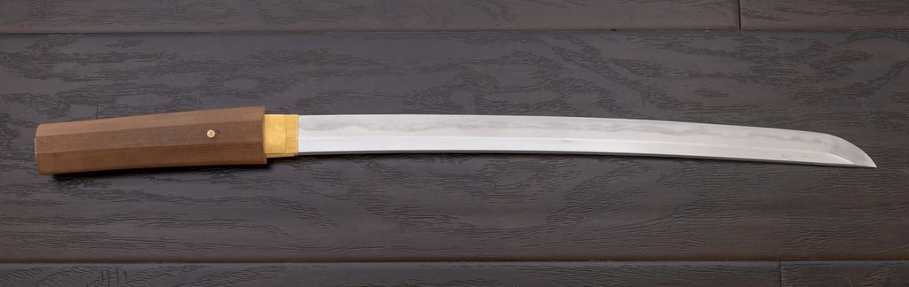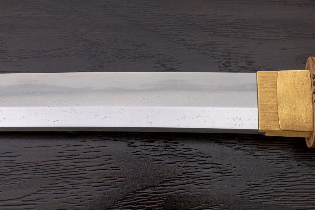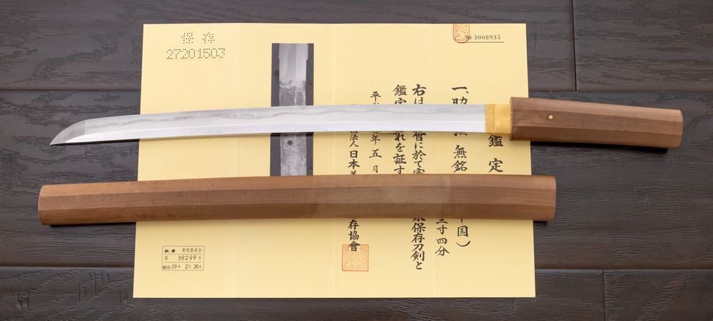 Antique Japanese Wakizashi in Shirasaya, with Paper. Nice stout shinogi-zukuri-shaped wakizashi from the late Koto period, Itame hada grain, nioi-deki gunome midare hamon with ko-nie and sunagashi, chu-kissaki with kaen and o-maru boshi (different on both sides) with short turn back. O-suriage, mumei nakago with two mekugi-anas. The blade length is 40.6cm or just under 16" long. Top quality two-piece gold foil over copper habaki, with vertical and horizontal decorative file marks. Mounted in a wooden shirasaya resting scabbard. Includes an NBTHK paper dated Heisei 27 (2015) that attributes the blade to "Uda Hirakuni". There were three generations of Etchu smiths that signed this way, working in the late Koto period around 1501 to 1573. Condition is very good to excellent, the blade in a nice state of polish, showing a clear hada and well-defined hamon and boshi. There are numerous small spots and stains from old dried oil that with proper care and cleaning could be minimized. The nakago shows a dark brown patina with light rust on the surface and some old pitting. The habaki is very nice, with a couple of tiny light scratches from use. The shirasaya is older, showing a filled and re-drilled hole in the handle, with stains from having a paper taped around it. In thin purple shirasaya cloth bag. Est.: $800-$1,200.