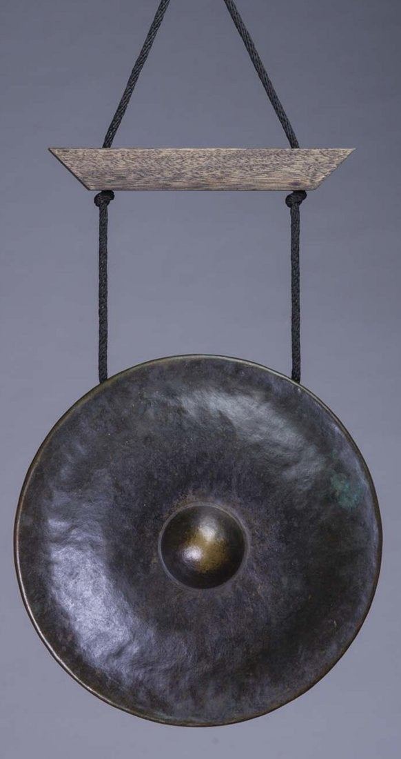 Antique Meditation Gong South East Asia 19th century. Size 14 3/4 icnhes diameter. Copper Gong. with Mahogany wood mount with beater. Ex J. Ducosin Collection. HI collection.