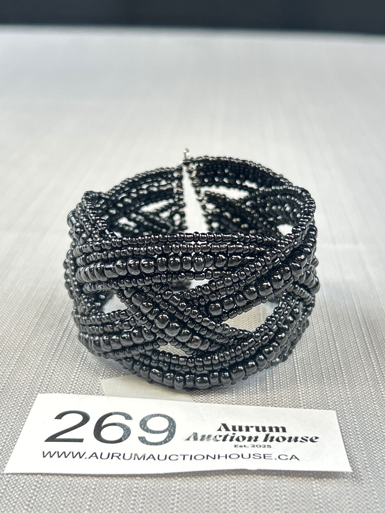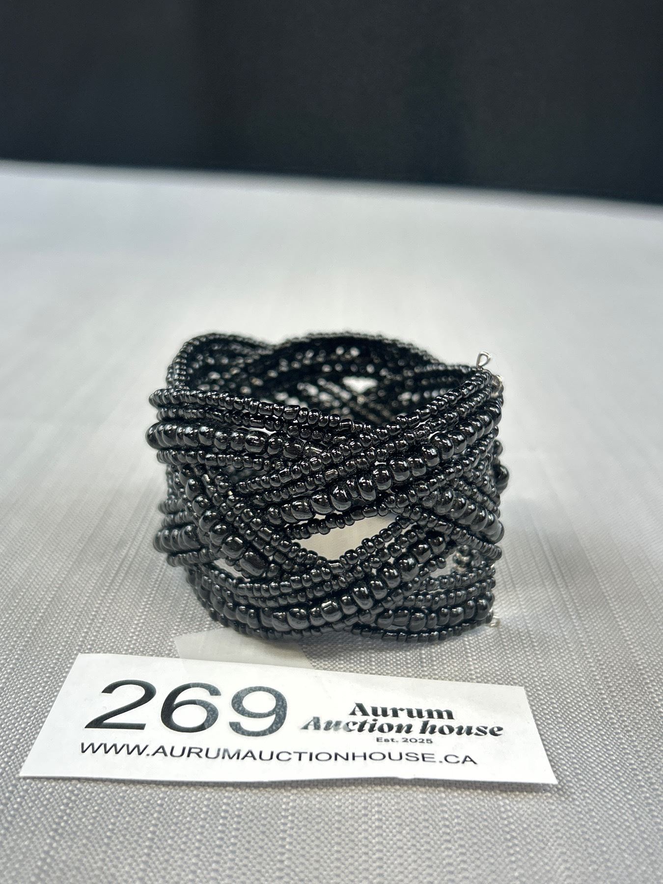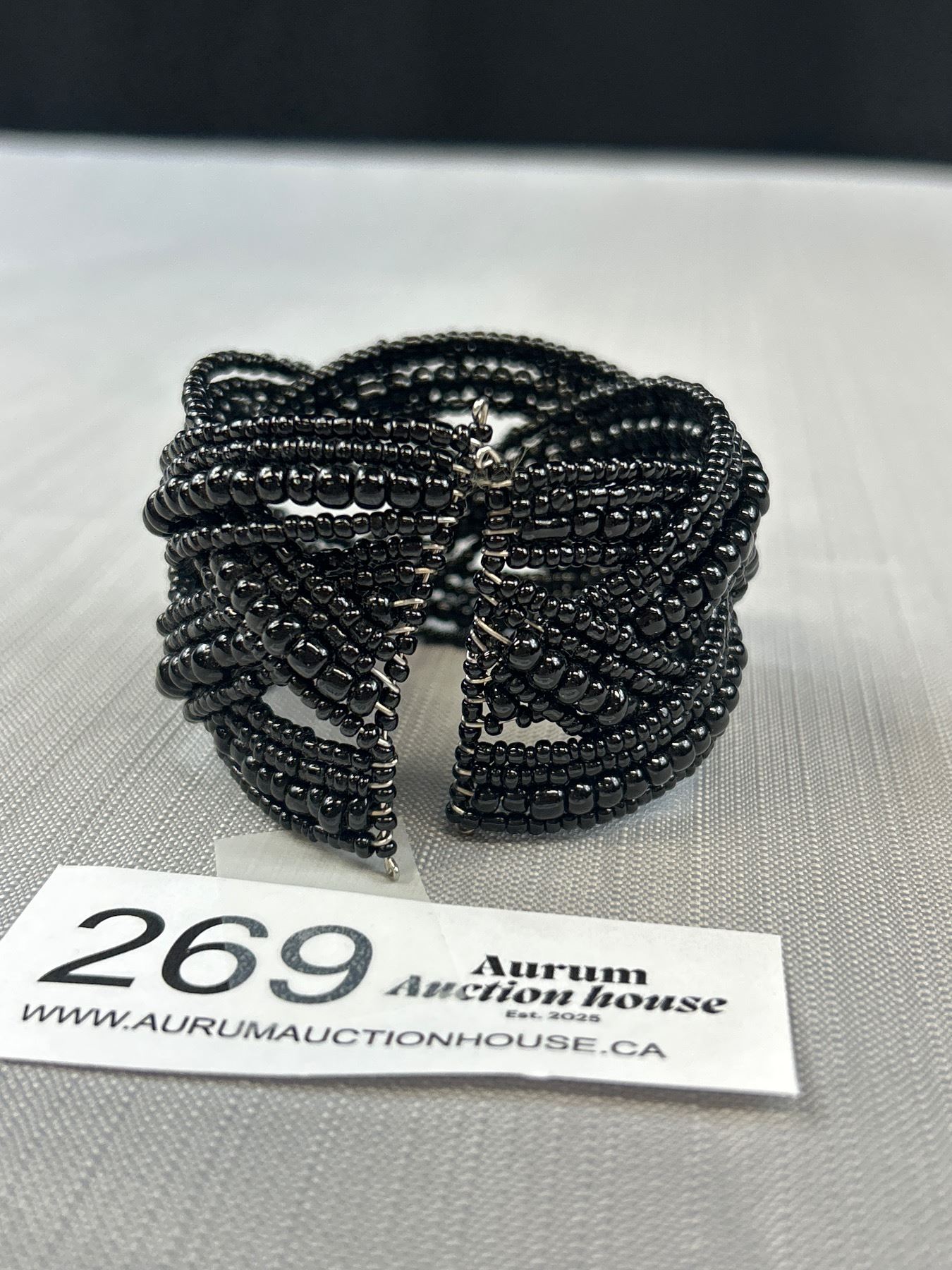 Antique Micro Glass Beads Open Cuff Black Bangle