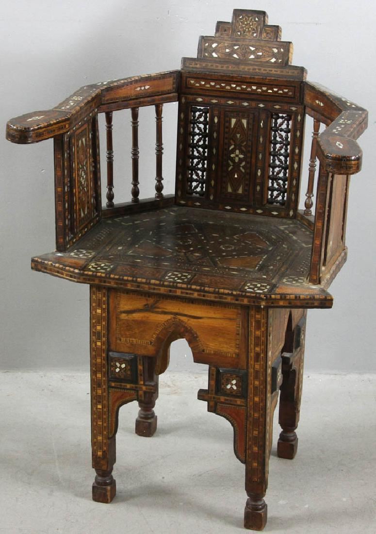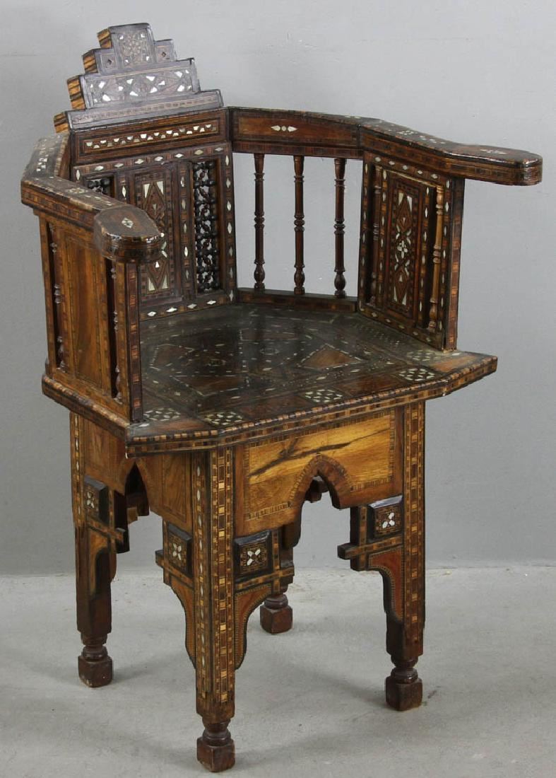 Antique Moroccan inlaid chair, 32" H x 23 1/2" W x 16" D. Provenance: Medford, Massachusetts collection.