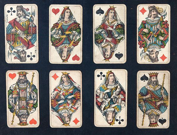Antique Playing Cards, C. 1880. A set of 8 cards printed in chromolithography by C.L. Wust from Frankfurt, Germany of Rococo style. Matted in an anitque wooden frame, overall 16�" x 13".