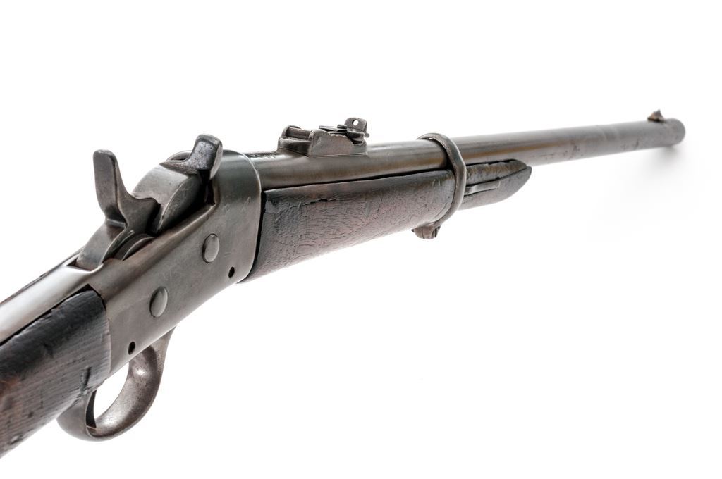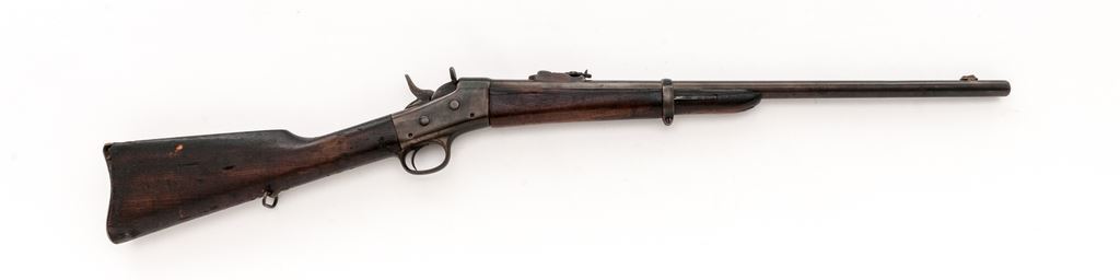 Antique Remington Rolling-Block Military Carbine, NVSN, .46 CF cal., 23.75" round barrel marked at breech with 2 dots followed by 4 letters (perhaps Arabic or Farsi?) has open sights; large No. 1 receiver is unmarked, has central hammer and rolling breechblock with auto ejection, integral loop trigger guard and upper/lower tangs; oil-finished forestock retained by a single band, matching buttstock with sling loop at belly, brass curved buttplate. Mfg'd ca. 1867-88. Condition is good retaining no original finishes, having a generally smooth brownish tone (likely added later) to steel, clean brass. Stocks are sound showing the expected marks of age and military use, the forend with crudely filled ramrod channel, the buttstock with chips out at top of buttplate, both with later varnish. Action is smooth, bore is clean showing overall frosting and vestigial rifling. Est.: $300-$450. (Antique)