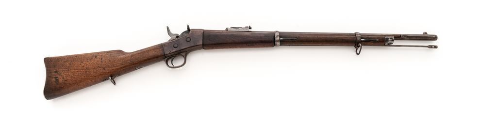Antique Remington Rolling-Block Rifle, NVSN, .50 CF cal., 26" round barrel has open sights, right-side 3.75" bayonet lug and bar, marked at breech with crudely chisel-cut (perhaps Nepalese) lettering in two rows; receiver with similar marks at curved top; steel fittings include loop trigger guard, curved buttplate, two spring-retained barrel bands and nosecap; oil-finished hardwood forestock has channel for steel ramrod with slotted tip, matching buttstock with sling loop at belly. Barrel and receiver have browned finish, perhaps arsenal-added. Condition is good retaining most of the browned finish, bands and buttplate are mostly smooth gunmetal gray-brown, nosecap with cleaned erosion. Stocks are sound with light marks; buttstock perhaps an arsenal replacement. Action is defective (hammer doesn't hold cock), bore shows overall mild erosion and vestigial rifling. Est.: $250-$350. (Antique)