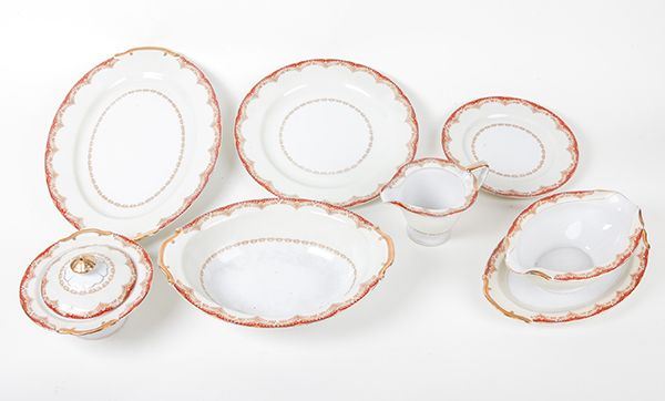 Antique Set of Bone China. Each marked on base "Versailles Pd Japan". White "doily" pattern on cream body with outer floral decoration of gold and vermilion with gilded edges. Consists of: