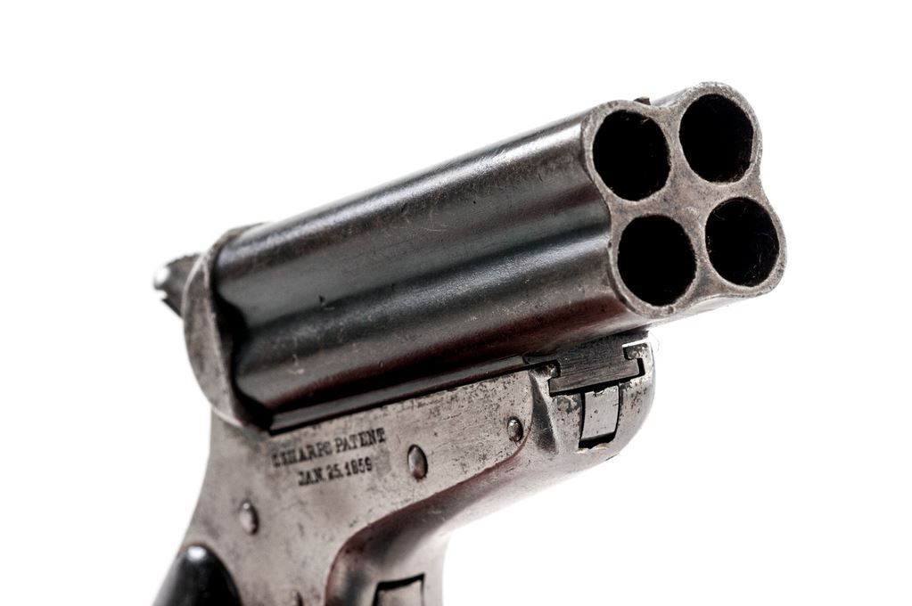 Antique Sharps Breech-Loading 4-Shot Pepperbox Pistol, Model 4C, #12963, .32 LRF cal., 3" square barrel group slides forward for loading/extraction; iron frame marked "C. Sharps Patent/Jan. 25, 1859" at right, has left-side barrel release button, hammer with rotating striker, integral spurtrigger sheath and "bird's head" gripstraps; 2-pc. varnished walnut grips. Mfg'd ca. 1859-74. Condition is very good retaining approx. 40% original blue and silvered-out case colors. Grips are sound showing light wear, a few minor dings, 35% finish. Edges and markings are sharp, barrel lockup is tight. Action is crisp, bores show frosting and fine rifling. Est.: $450-$650. (Antique)