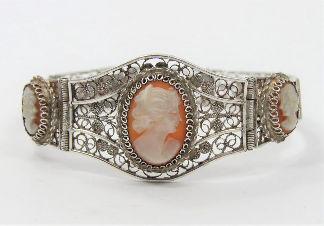 A very nice antique silver cameo bracelet. This estate piece features intricate silver wire filigree work in it's design. 6.5" in length and 23mm wide, weighing 15.5g