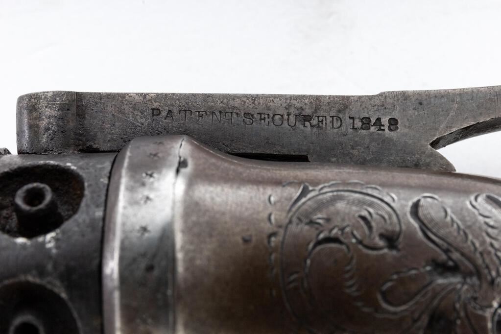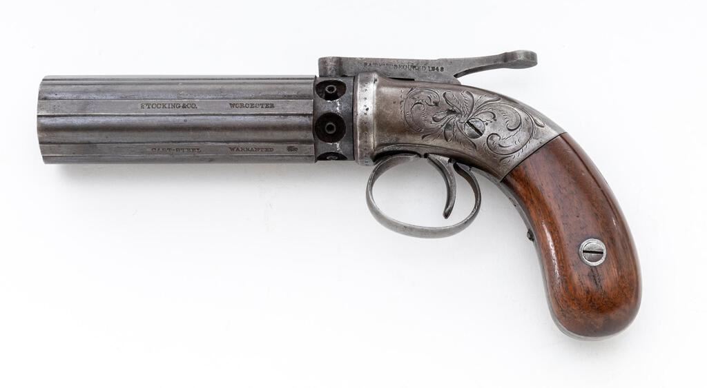 Antique Stocking & Co. Single-Action Elongated-Hammer Percussion Pepperbox Pistol, NVSN, .28 cal., 4" ribbed 6-shot barrel group marked "Stocking & Co. Worcester" and "Cast Steel Warranted" with "(sun rays)" proof mark on adjacent ribs; frame lacks nipple shield (rare), has distinctive long cocking-spur on hammer marked "Patent Secured 1848" at left, floral engraving, separate loop trigger guard, integral "bag-style" gripstraps, 2-pc. varnished walnut grips. Mfg'd ca. late 1840s-early 1850s. Condition is very good retaining no original blue but smooth gunmetal gray, sharp markings and engraving. Sound grips showing a few tiny marks and all original varnish. Action is crisp, smoothbores are bright with light frosting. Est.: $800-$1,200. (Antique)