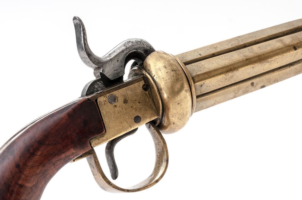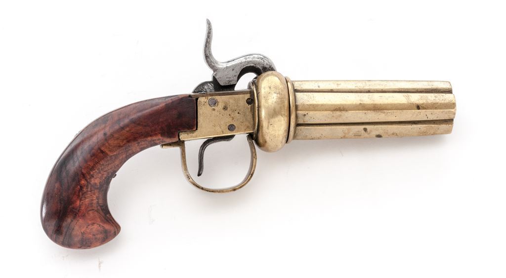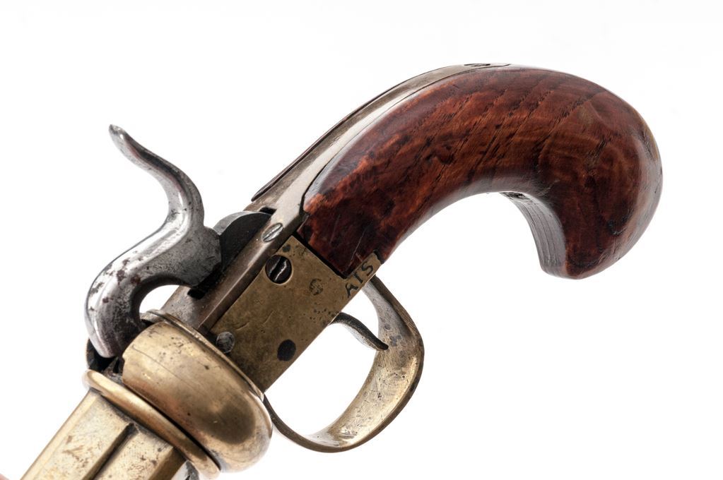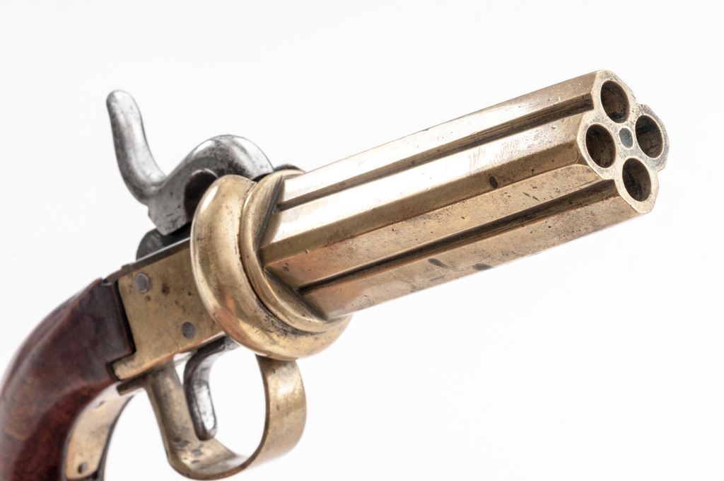 Antique Swedish Made All-Brass Single Action Percussion Pepperbox, in the American Darling Brothers style, NVSN, 8mm cal., 3.5" hand-revolved 4-shot squared brass barrel group, brass boxlock frame marked "AIS" at left, has large "tubular" nipple shield, steel hammer and trigger, separate loop trigger guard and integral gripstraps with varnished "bird's head" walnut grips. Mfg'd ca. 1840s-50s. Condition is fine showing lightly toned brass, sharp edges and markings. Sound grips have a few dings to left side, nice grain and color, most varnish. Action is crisp, smoothbores show occasional moderate erosion. Est.: $500-$700. (Antique)