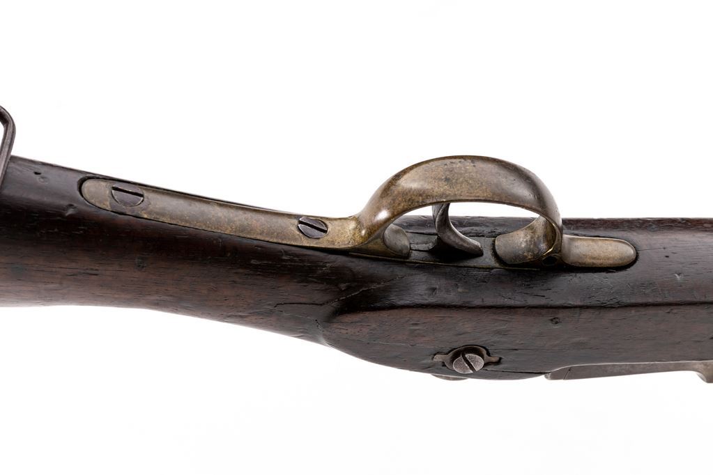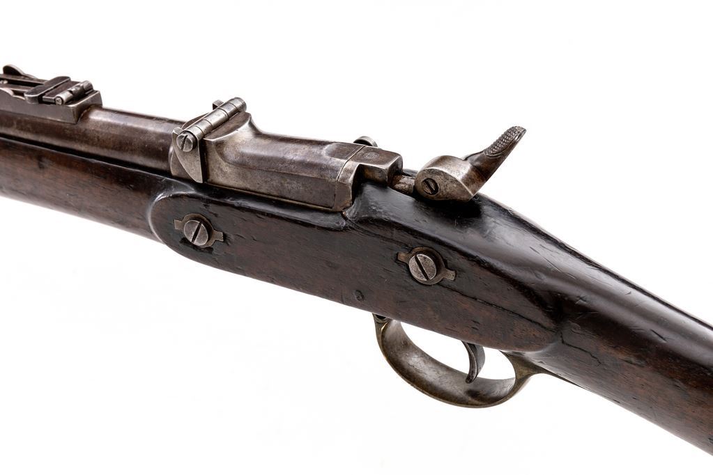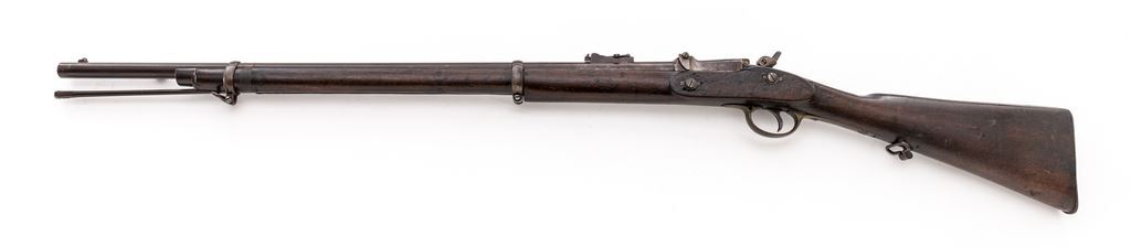 Antique Tower P-1856 Single Shot Infantry Rifle, with Unusual Breechloading Cartridge Alteration, #406, .577 CF cal., 30" round barrel marked with a chrysanthemum-like mark at breech, has block-blade front and sliding-leaf rear sights, bayonet lug at right; 3.75" breech marked "406" and what appears to be a Japanese character at top, with hinged "trapdoor" marked "406" with right thumb lever and bolt-like firing pin attached to unique hammer; flat lockplate marked "1868/Tower" ahead of hammer and "(large crown)" behind; mountings consist of brass trigger guard, iron buttplate, nosecap and 2 winged lock screw escutcheons, 2 clamping bands retaining the slotted/grooved ramrod. Oil-finished walnut fullstock has raised panels at each side of lock, step at lower band. Mfg'd ca. 1868. Condition is good having overall brown tone with scattered light discoloration to barrel and bands, silvered-out case colors, moderate patina to brass. Stock is sound with the scattered marks of military use, minor gouges at buttplate and lock, 3.25" crack emanating from rear lock screw. Action is crisp, bore shows overall frosting with scattered moderate erosion and very good rifling. Est.: $900-$1,200. (Antique)