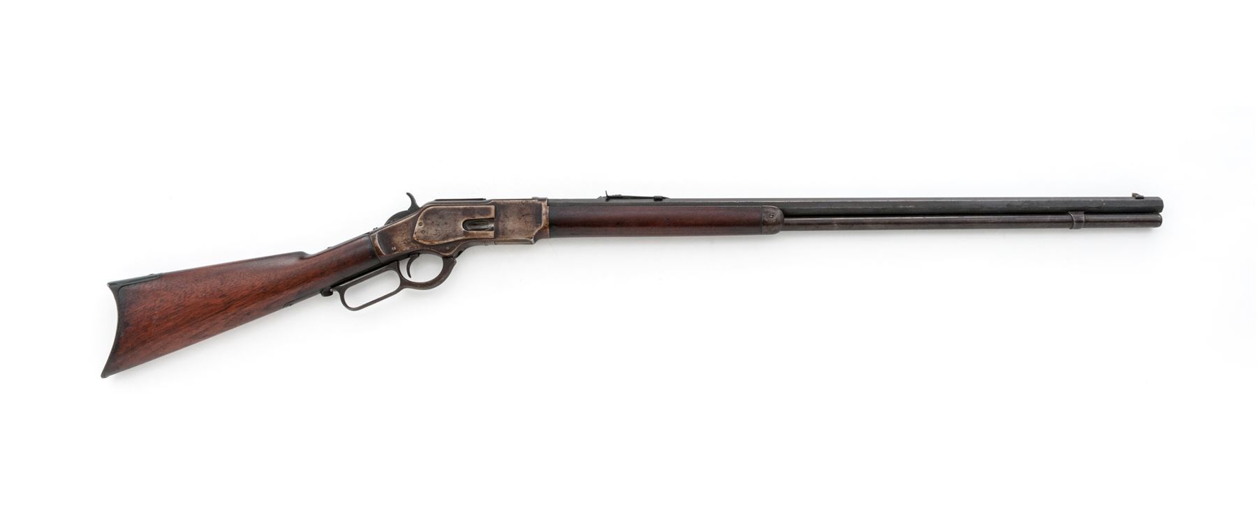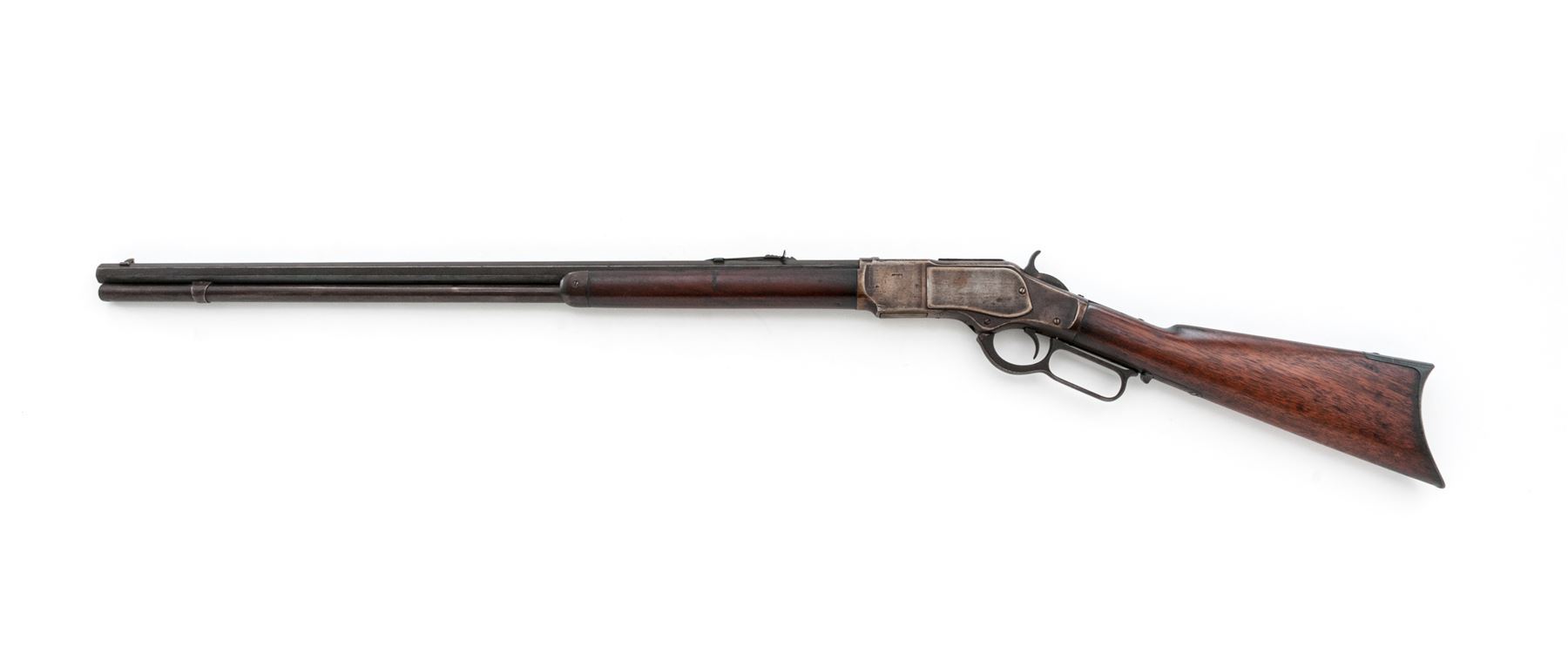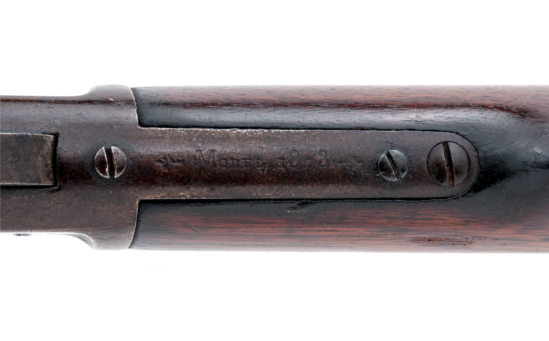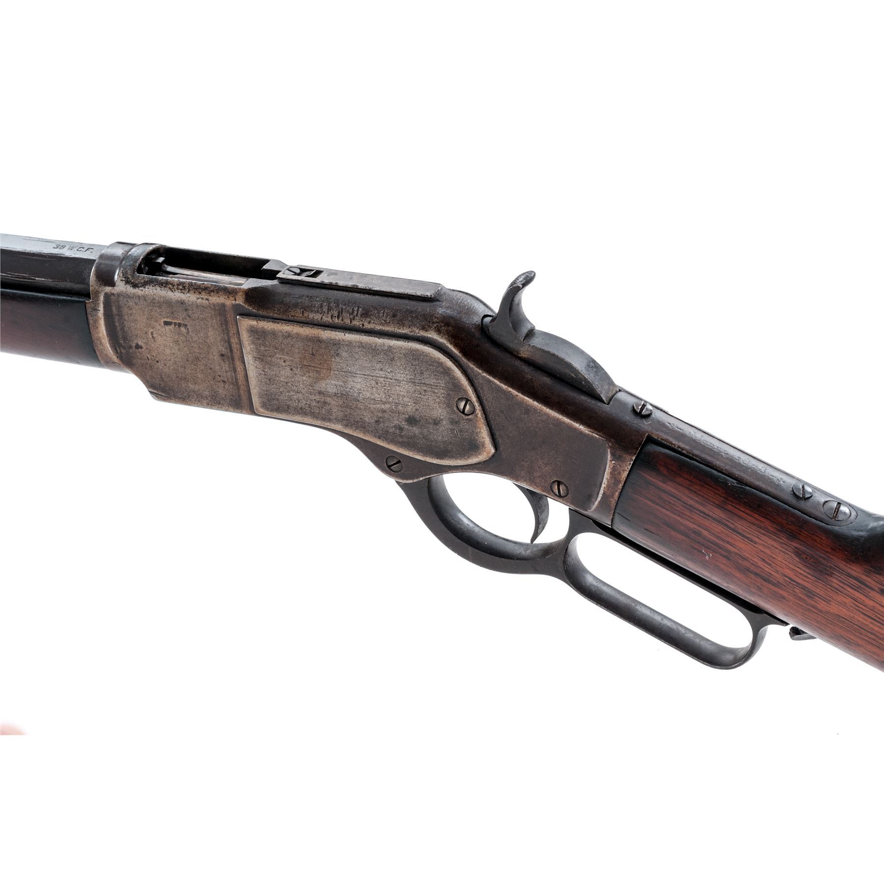 Antique Winchester Model 1873 Lever Action Rifle, #200841B, .38 WCF (.38-40) cal., blued 28'' octagonal barrel with block-blade front and adjustable open rear sights marked with the Winchester name, address and King's Improvement patent dates in two lines ahead of rear sight, and ''38 W.C.F.'' behind; full-length magazine tube; steel receiver marked ''Model 1873'' on top tang and serial number on lower tang, missing the ejection port dustcover; steel operating lever, nosecap and crescent buttplate with sliding cover opening to butt trap for jointed cleaning rod (not present); oil-stained walnut forend and buttstock. Mfg'd 1886. Condition is very good, the barrel retaining approx. 85% thin original blue mixing with a brown patina (nicks near front sight, edge dings on flats near breech), the balance of the metal a smooth gunmetal gray-brown (traces of blue in protected areas of receiver). Stocks are smooth and solid showing nice grain and color (dings halfway down left side of forearm and bottom at receiver). Action is smooth; bore is clean with deep rifling. A desirable '73 with its long 28'' barrel. Est.: $1,000-$1,500. (Antique)