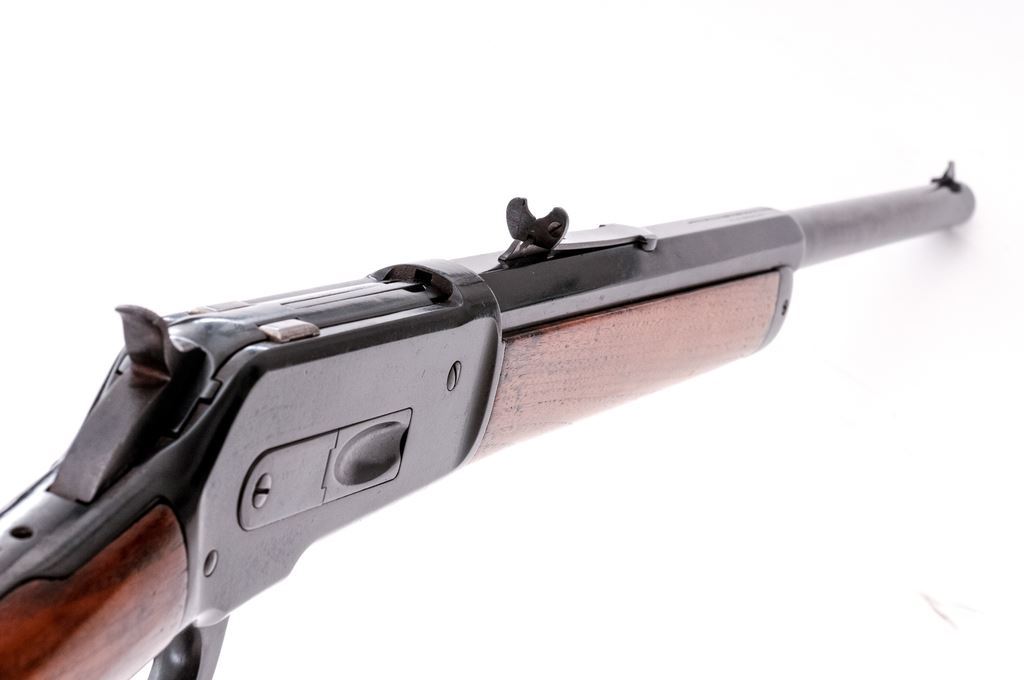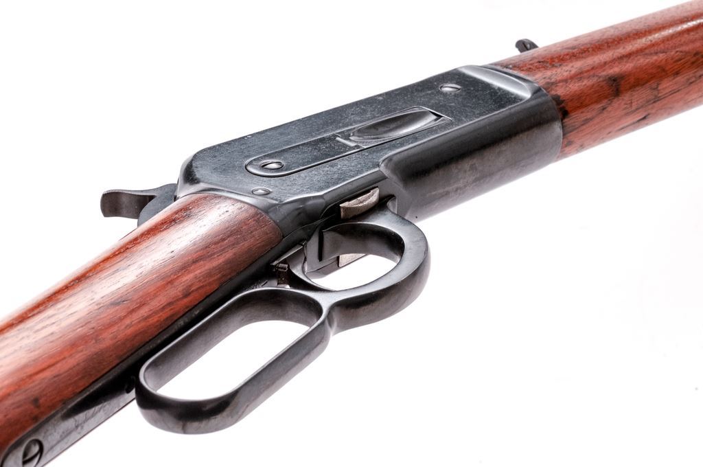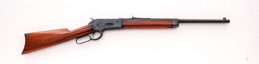 Antique Winchester Model 1886 Lever Action Short Rifle, #27864, .45-70 CF cal. (not marked), 22" half-round/half-octagonal heavy barrel, dovetailed bead-blade front and adjustable buckhorn rear sights, marked with maker's name and address at top flat, has button magazine; receiver has right loading port, top ejection, loop operating lever, marked "Model 1886" on upper tang, 1884-85 patent dates and ser. no. at lower; oil-stained walnut forend has a steel nosecap, matching straight buttstock a crescent buttplate. Mfg'd 1888. Condition is very good as completely refinished in deep blue; edges are mostly sharp, all markings are legible. Stocks are sound and smooth showing light marks, having been sanded with a later oil finish. Barrel may have been shortened (or even replaced) when restored. Action is crisp, bore is brilliant with sharp rifling. Est.: $1,200-$1,800. (Antique)
