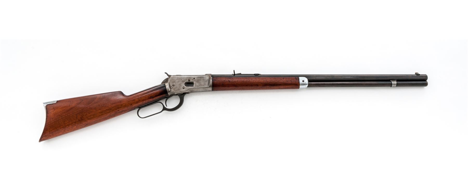 Antique Winchester Model 1892 Lever Action Rifle, #66088, .44 WCF (.44-40) cal., blued 24'' octagonal barrel, with dovetailed blade front and adjustable buckhorn rear sights, marked with maker's name and address on top flat, and ''44 W.C.F.'' at breech; blued tubular magazine; receiver is marked ''Model 1892/Winchester/Pat. Oct. 14, 1884'' on upper tang, and serial number at lower front; case hardened loop operating lever and hammer; oil-stained walnut stocks, forend with steel nose cap, buttstock with steel crescent buttplate. Mfg'd 1894. Condition is fine. Barrel and mag tube retain approx. 45% thinning original blue, mixing with brown; receiver is gunmetal gray; nose cap and buttplate bright metal. Stocks are solid and smooth, with perhaps an added coat of linseed oil or varnish, and lovely grain and color. Action is strong; bore is bright with deep rifling. This '92 is especially desirable with its octagonal barrel and largest-offered .44-40 caliber. Est.: $800-$1,400. (Antique)
