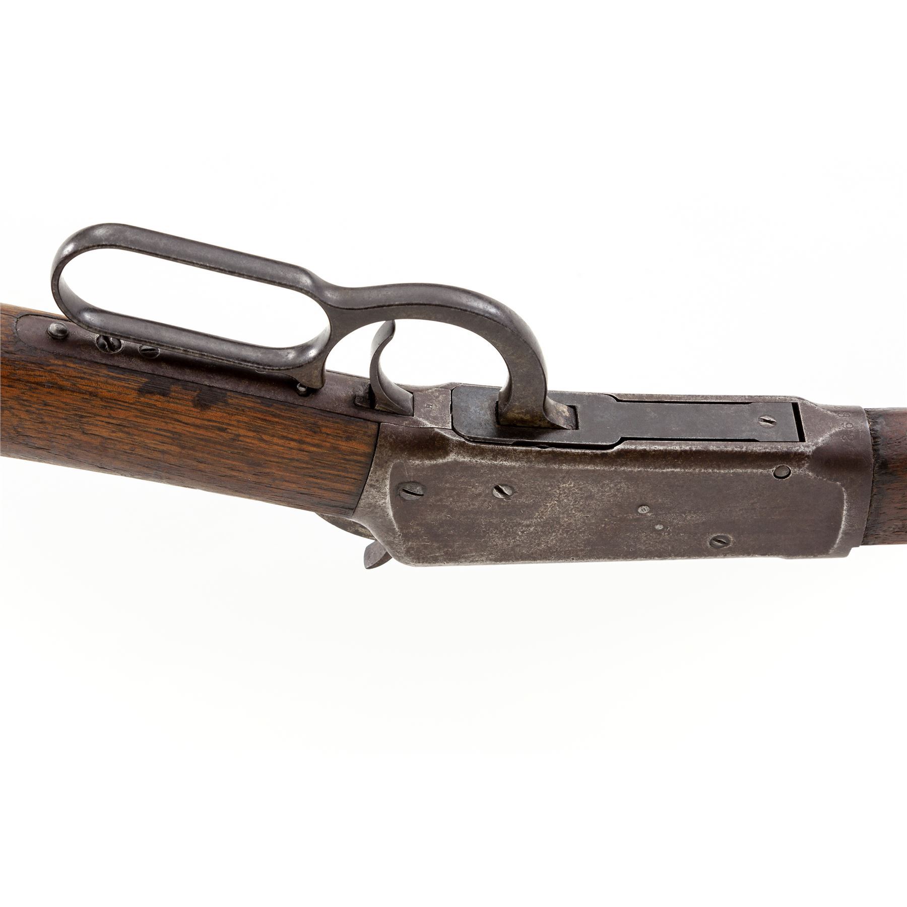 Antique Winchester Model 1894 Lever Action Rifle, #2892, .32-40 CF cal., blued 26'' octagonal barrel, with dovetailed blade front and adjustable buckhorn rear sights marked with the maker's name and address in two lines on top flat, and ''32-40'' at breech; blued full-length under-barrel magazine tube; blued receiver is marked ''Model 1894''/-Winchester-/Pat. Aug. 21, 1894.'' on top tang; case hardened hammer, loop operating lever, and crescent buttplate; oil-stained walnut forestock and buttstock. Mfg'd 1894, first year of production. Condition is very good: the steel parts show a smooth gunmetal gray-brown tone with occasional darkening and discoloration. Stocks are sound with scattered roughness and use/handling marks. Action is smooth; bore is clean with distinct rifling. A John M. Browning design, the '94 was Winchester's first smokeless powder lever action rifle, and remains in production today. Est.: $600-$900. (Antique)