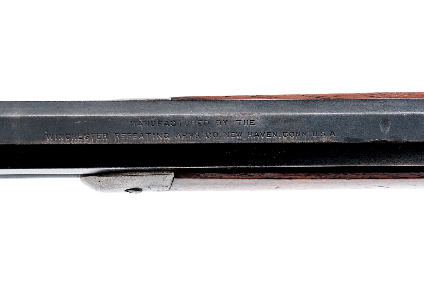 Antique Winchester Model 1894 Lever Action Rifle, #110107, .25-35 WCF cal., blued 26'' octagonal barrel, with dovetailed long bead-blade front and buckhorn rear sights, marked with maker's name and address on top flat, ''Nickel Steel Barrel/Especially for Smokeless Powder'' on left angled flat, and ''25-35 W.C.F.'' at breech; blued tubular magazine; receiver is marked ''Model 1894/Winchester/Pat. Aug. 21, 1894'' on upper tang, and serial number at lower front; case hardened loop operating lever and hammer; oil-stained walnut stocks, forend with a steel nose cap, buttstock with a steel crescent buttplate. Mfg'd 1897. Condition is very good. Barrel and mag tube retain approx. 75% original blue (with perhaps some later cold-blue touch-up); receiver, nose cap and buttplate are a cleaned gunmetal gray. Stocks are solid and smooth with minimal marks, two filled areas on left forearm, and a thin later coat of varnish or linseed oil. Action is strong and smooth; bore is clean with general erosion and defined rifling. Est.: $700-$1,100. (Antique)