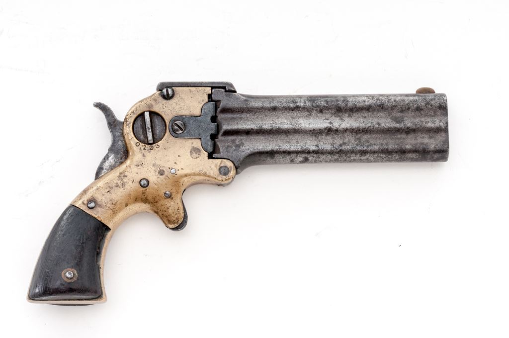 Antique Wm. W. Marston 3-Barrel Top-Break Single Action Spurtrigger Pistol, #801, .32 RF cal., unmarked 4" vertical barrel group; brass frame marked "Wm. M. Marston/Patented/May 26, 1857/New York City" in oval over "Improved 1864" at left side, swivel barrel release at top, bottom front hinge, right-side extractor and barrel selector marked "0/1/2/3", central hammer, integral spurtrigger sheath and gripstraps, varnished 2-pc. walnut grips. Mfg'd ca. 1864-72, just 3,300 qty. Condition is good retaining no original finishes, the barrels being gunmetal gray with scattered discoloration, the brass showing light age-toning. Grips with shrinkage and a half-inch sliver out at right panel, no finish. Barrel lockup is tight, hinge secure, edges and markings sharp. Action is crisp, bores show moderate erosion (heavier at muzzles), good rifling. Quite rare with this 4" barrel group. Est.: $750-$1,000. (Antique)