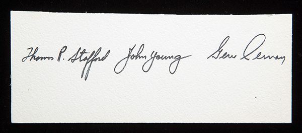 Apollo 10 Crew Autographs. Tom Stafford, John Young and Gene Cernan all signed this piece of presentation board. The presentation board measures 2 � x 6 �". All are nice bold signatures and would go nicely with a piece of Apollo 10 memorabilia.